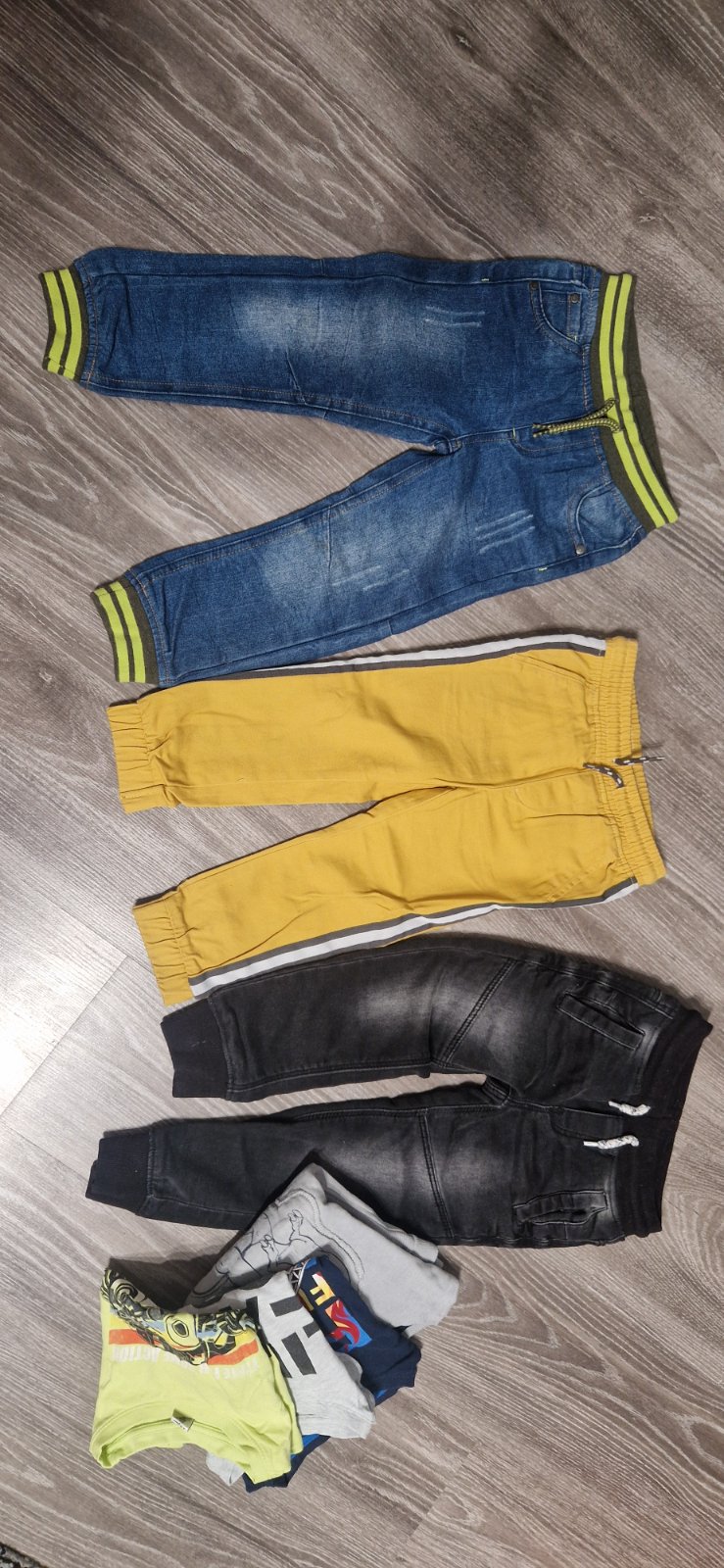 chlapčenské nohavice 2x 98 veľkosť a čierne sú 104 veľkosť plus nejaké tričká a mikina, všetky nohavice ako nové malo nosené akurát mikina je 116 veľkosť trosku väčšia čo som našla ešte zabudnuté. Na dobierku neposielam 🙂