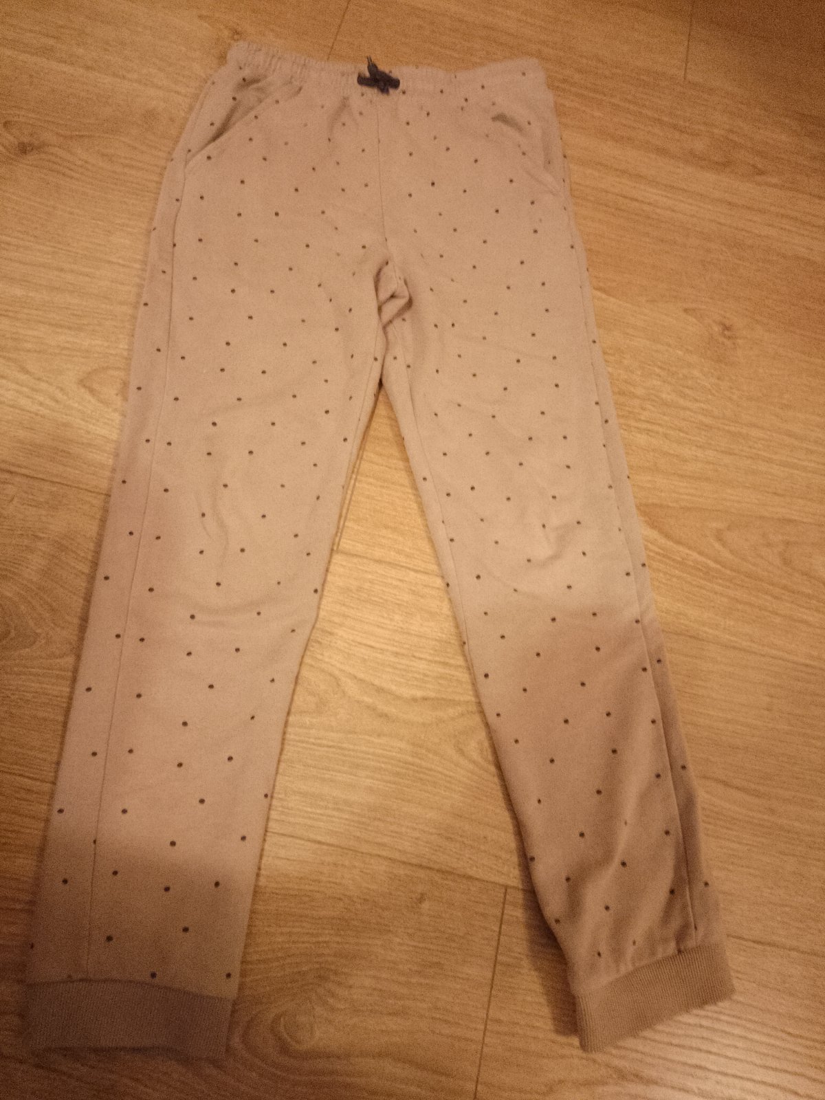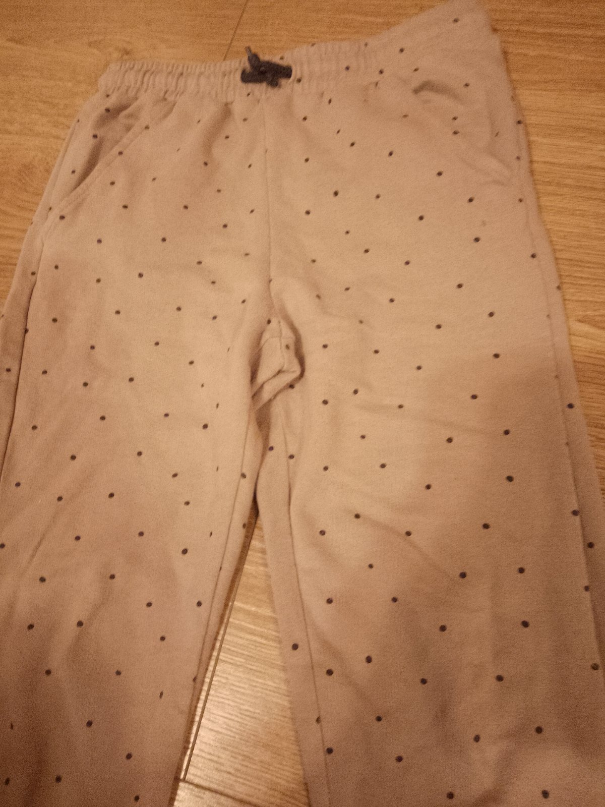 Farba cappuccino,, bavlna a elastan, pekne sedia, bez fľakov a bez dier, vpredu dva vačky, v páse guma a šnúrka.