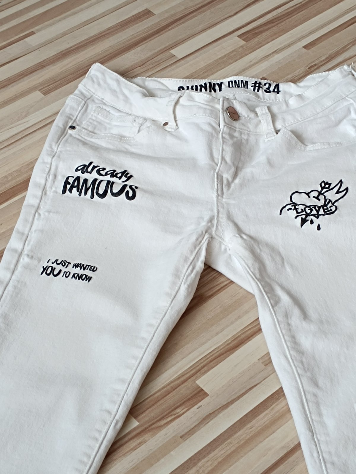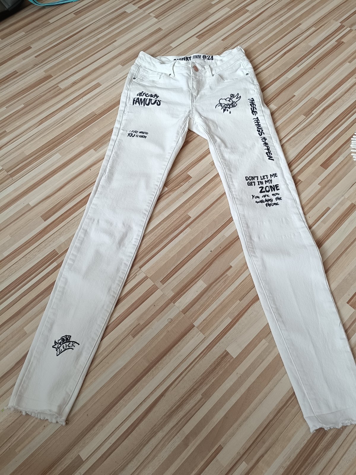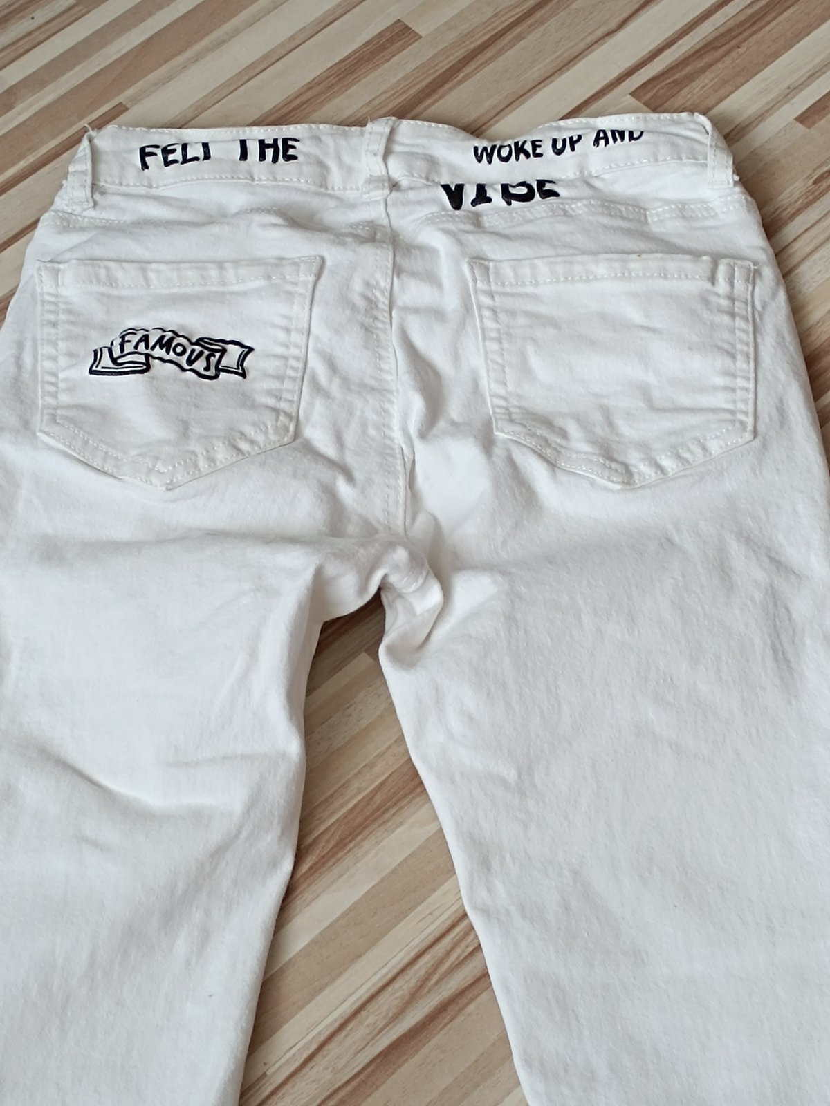 Biele frajerske rifle pre štíhle dievča, látka je poddajna. V peknom stave. Nosené ako 11,12 rokov. Čiže neviem presnú veľkosť. Pás 32cm v kľude až do 41cm. Dĺžka 95cm.stehno 20cm v kľude.