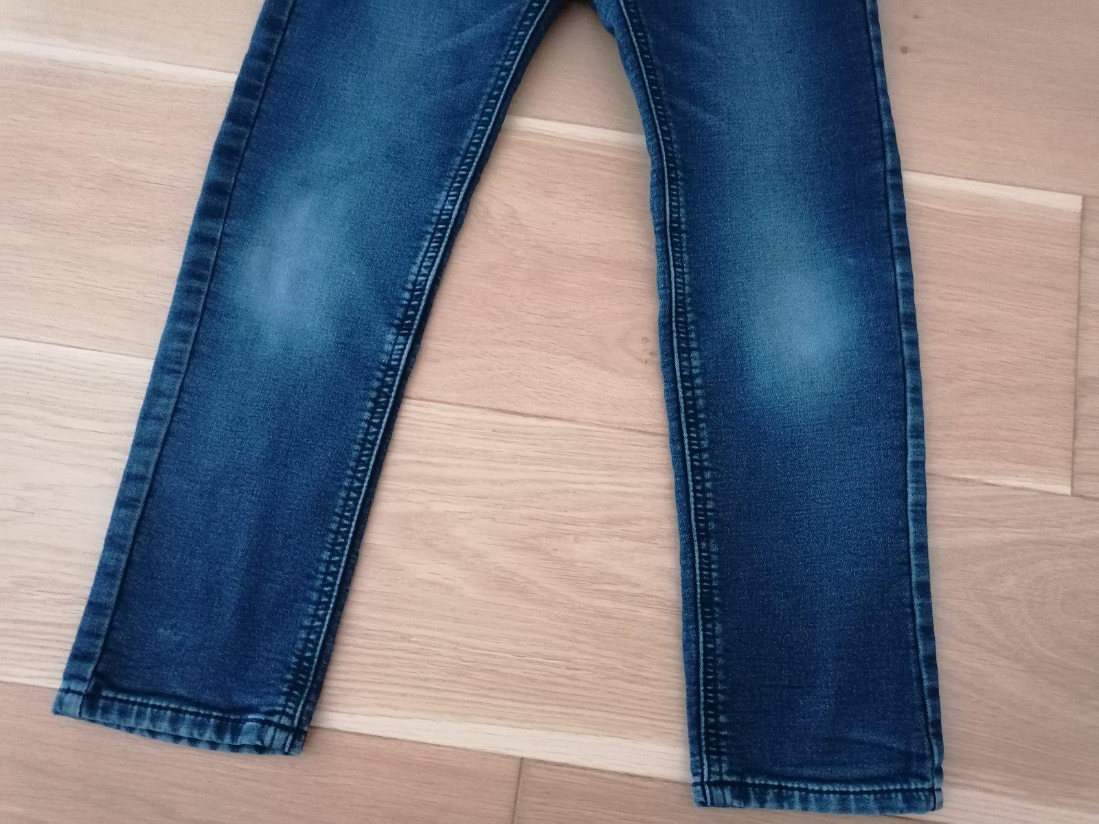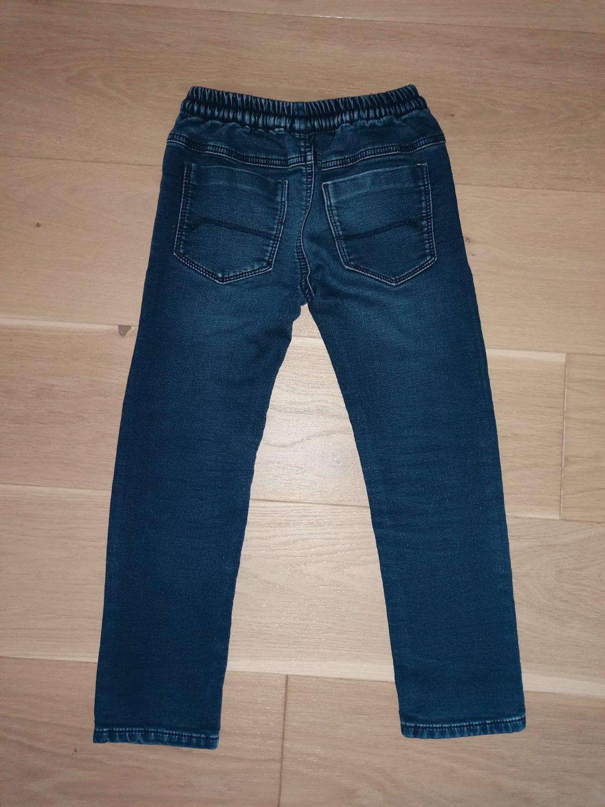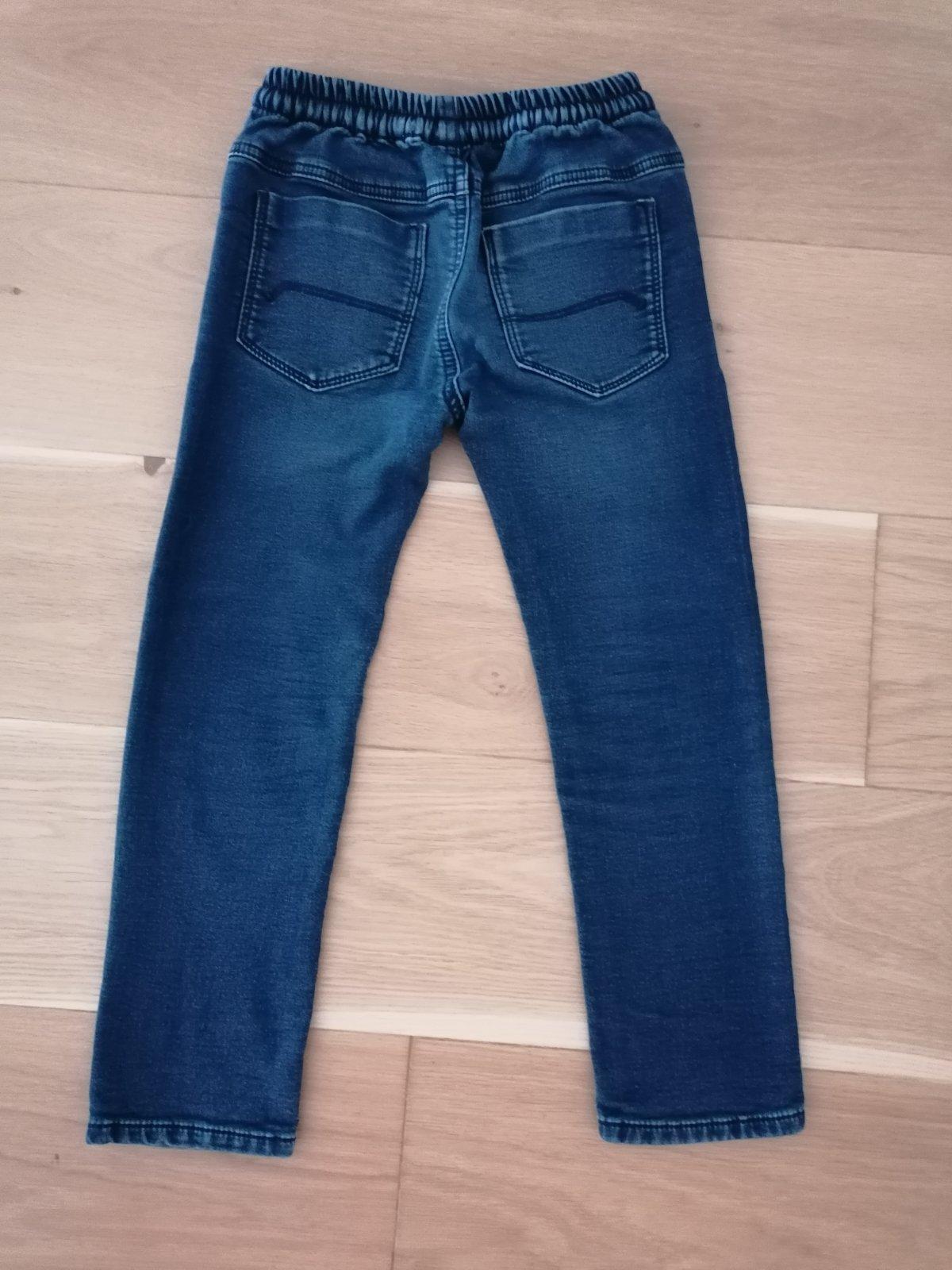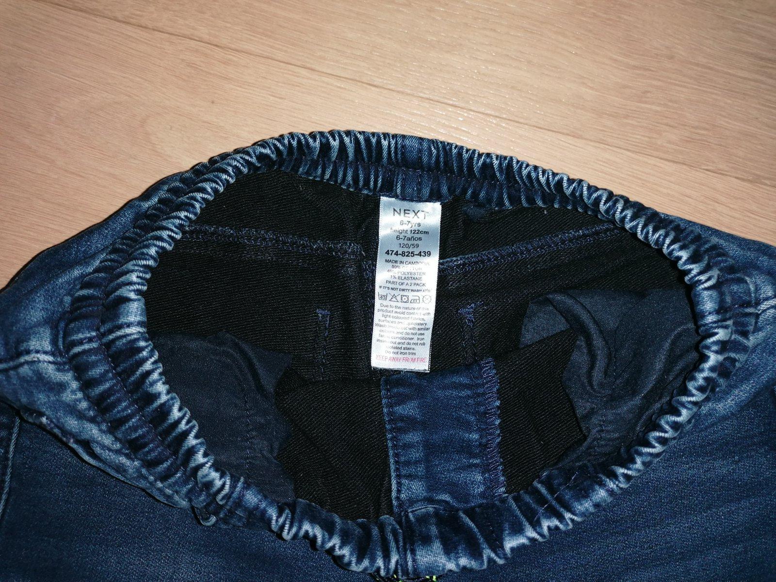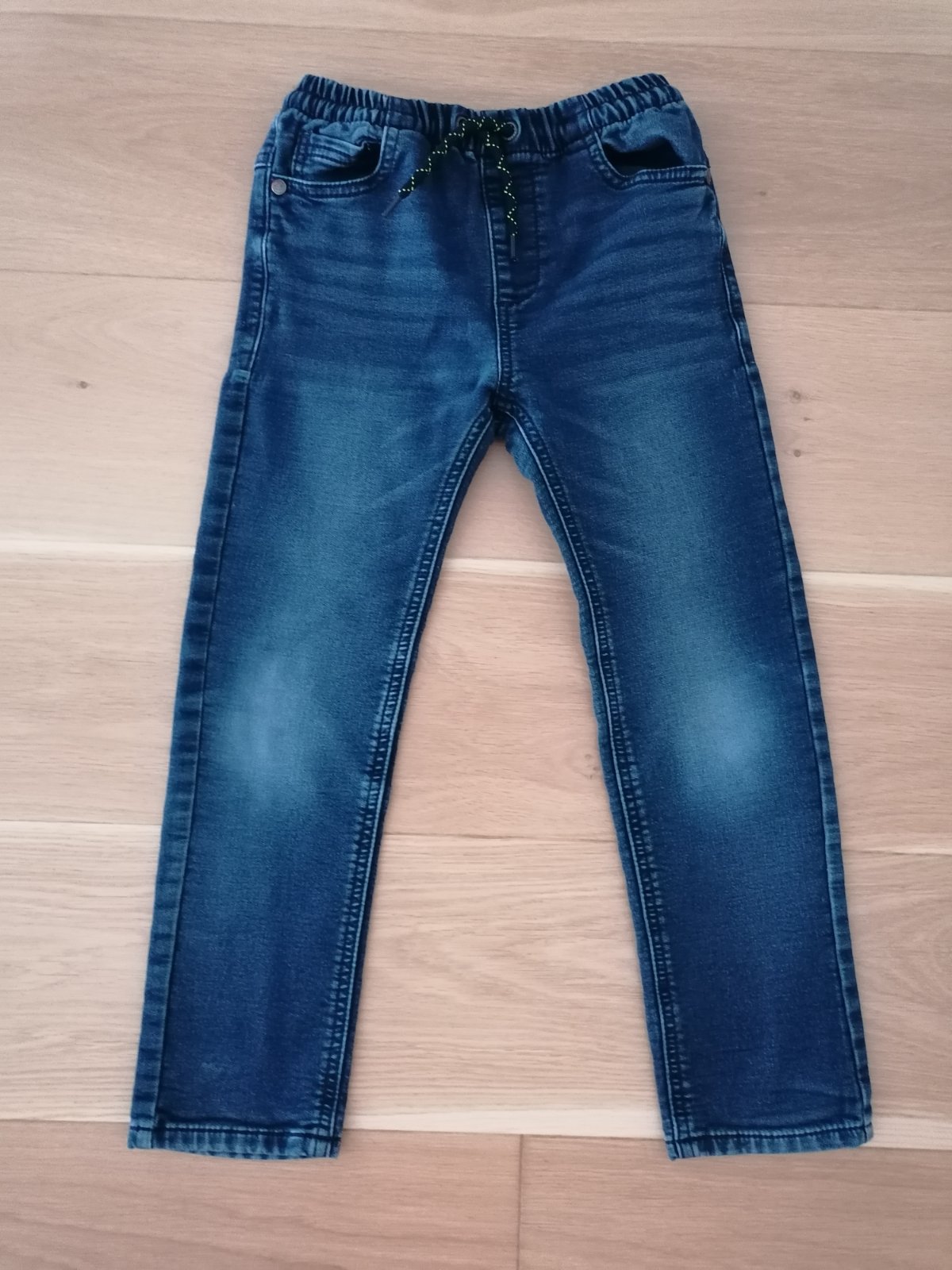 Rifle zn. Next veľ. 122, 59% bavlna, 40% polyester, 1% elastan, pás na gumu + šnúrky na stiahnutie, vredu aj vzadu vrecká, farba tmavomodrá, vyšúchaný vzhľad.