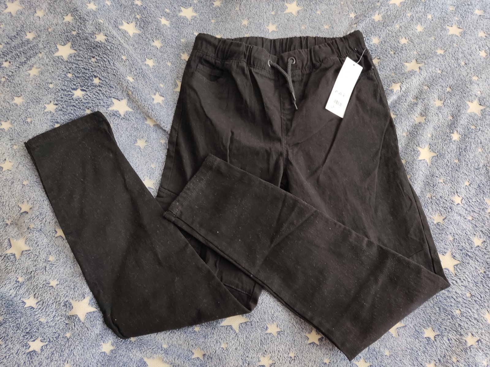 Veľmi zachovalé, ako nové, nohavice v. 164, na vek 13-14, strečove, dĺžka 83cm, pas možno stiahnuť vnútornou šnúrkou po oboch stranách, cca 38cm podľa stiahnutia, boky 43cm. Cena bez poštovného, mo...