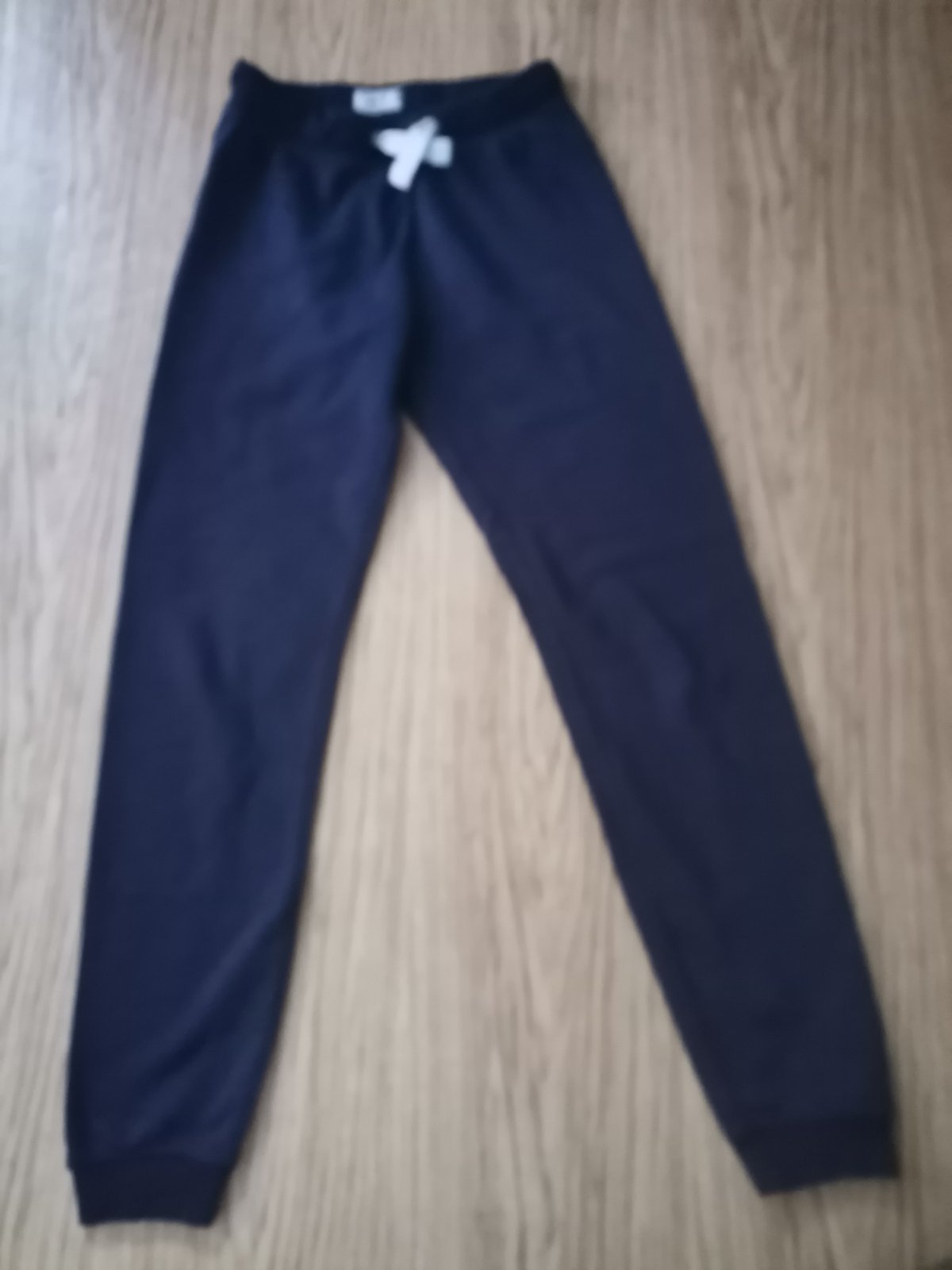 Bavlnené teplejšie tepláky, sú nosené, v páse na gumu a šnúrku, dole patenty, dve vrecká vpredu. Veľkosť odhadujem na 158, výrobca Pepperts. Miery: d - 89/69 cm, pás 2x32 cm.