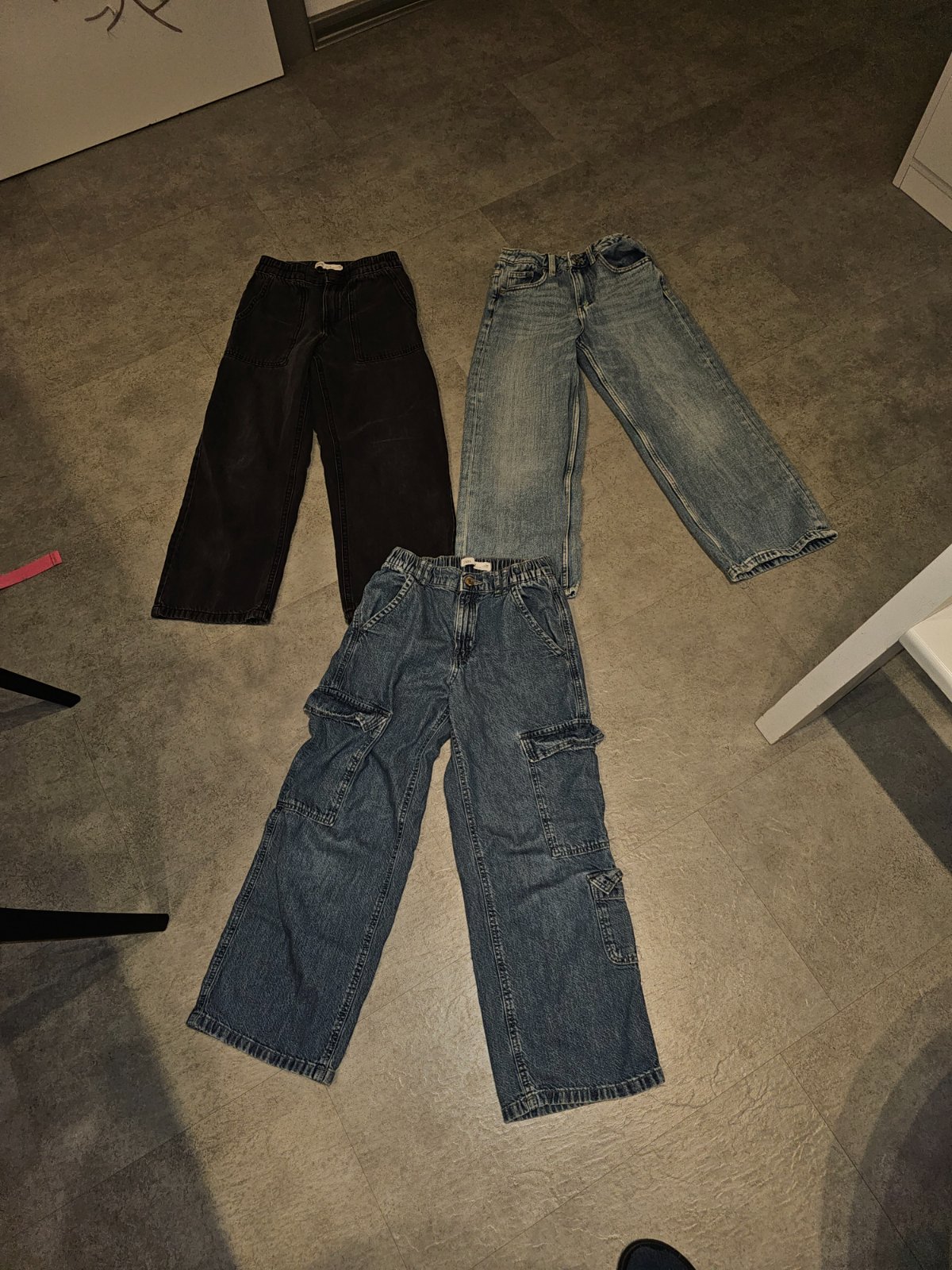 Rifle sú v peknom nosenom stave bez poškodenia. Celková dĺžka 78cm šírka v pase: 2x31cm Materiál: 70% bavlna 28% polyester 2% elastan