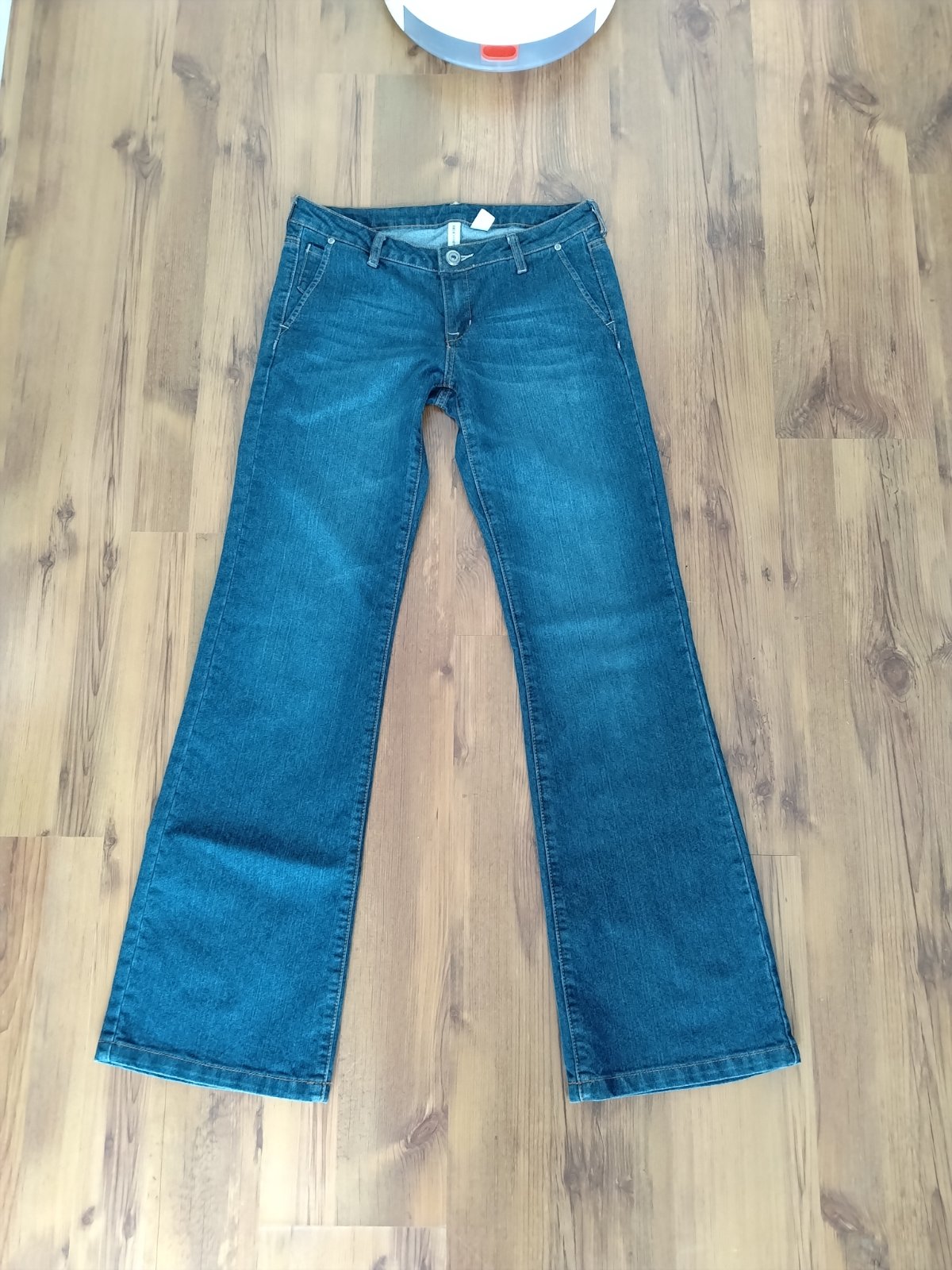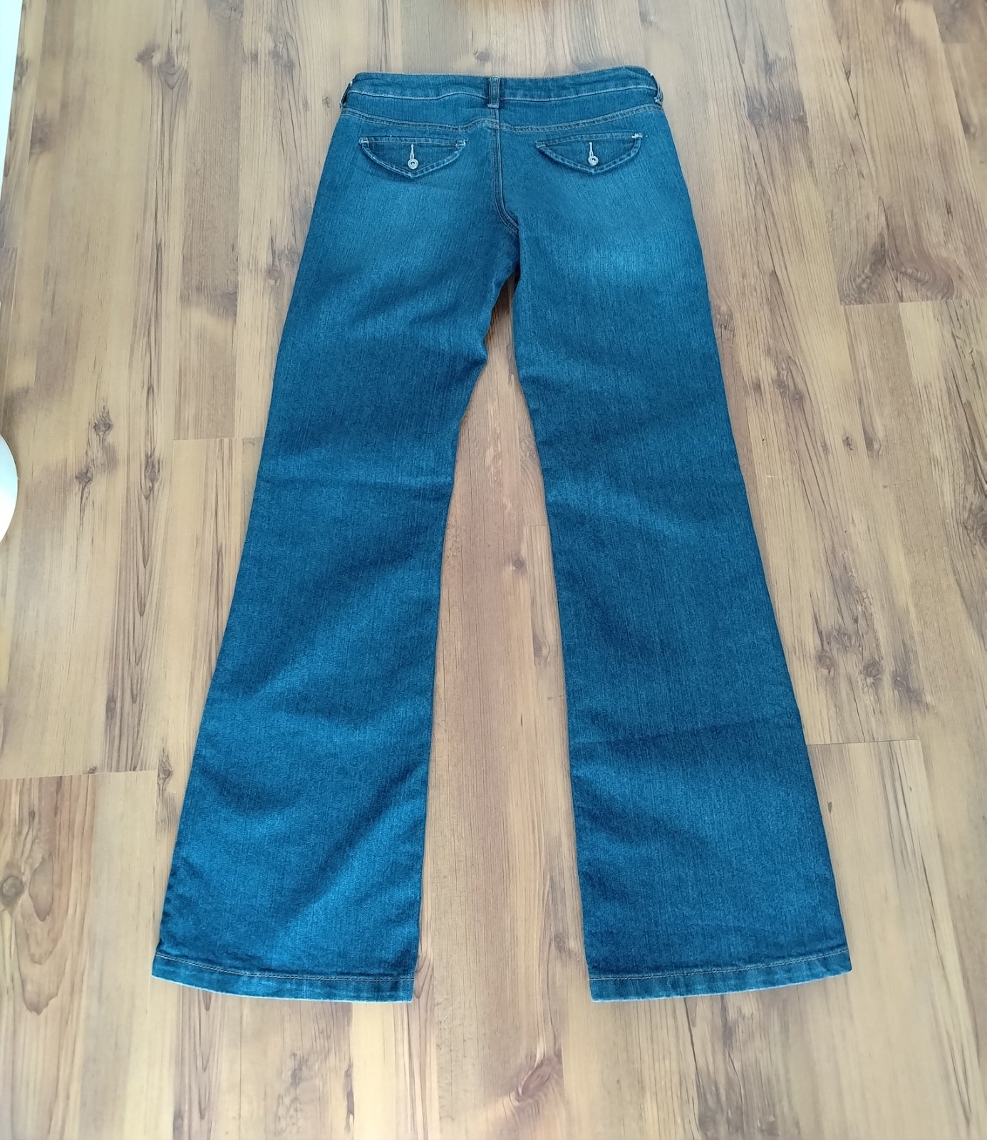 Jeansy s kamienkami vo farbe rifloviny na prednom diely - dávajú elegantné odlesky. Veľkosť 38, dĺžka 95 cm, pás 40 cm. Výborný bezchybný stav !