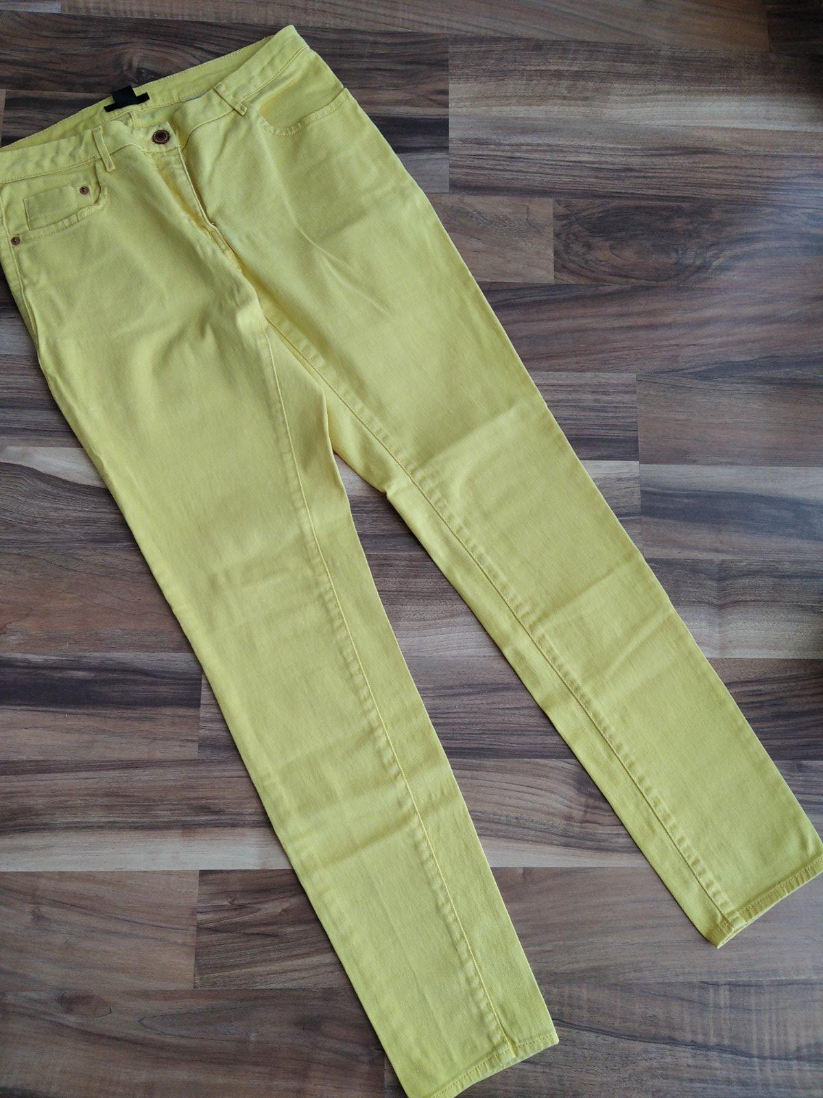 Pekné zlté rifle, elastické, velkost 38. Pás-37cm, boky-42cm, dlzka-92cm, stehno-21cm.