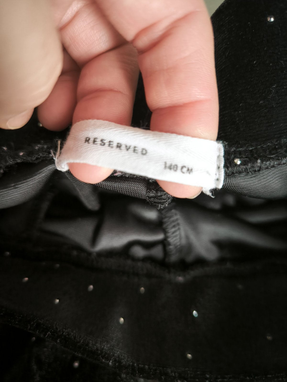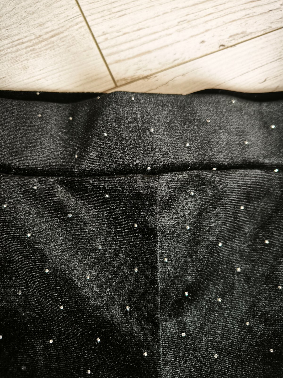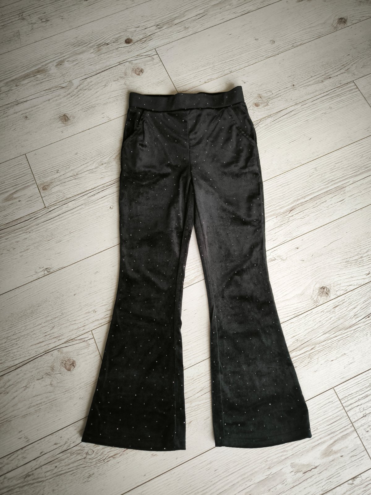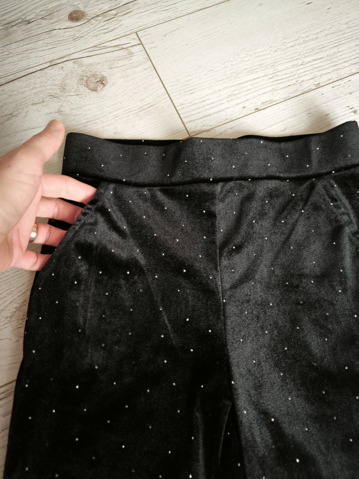 Na sviatočné chvíle ako stvorené, zamatové, naspodku rozšírené nohavice. Trblietky kvalitné, nič neopadáva, majú vrecká. Celková dĺžka 84cm, v páse gumička. V top stave.