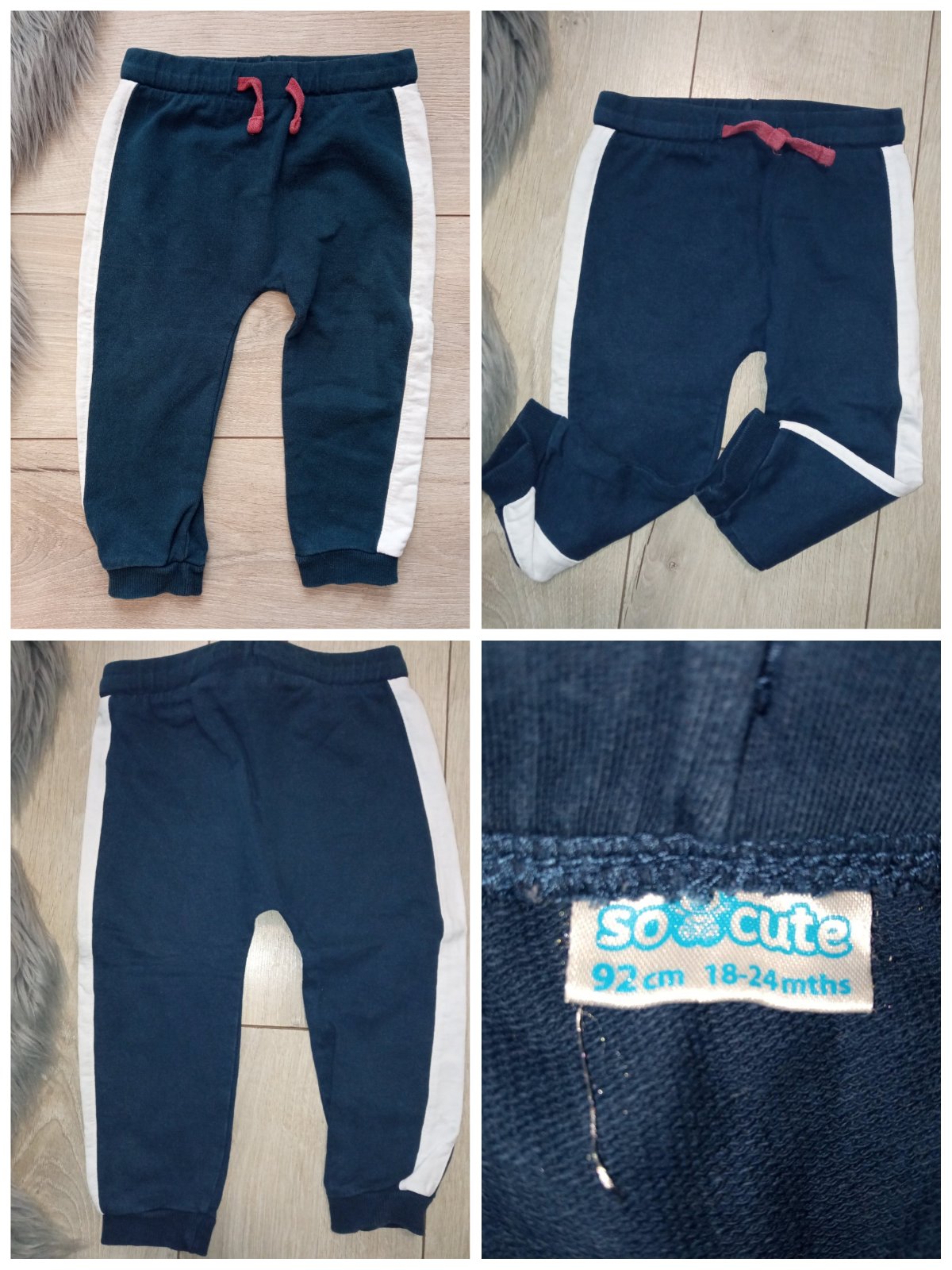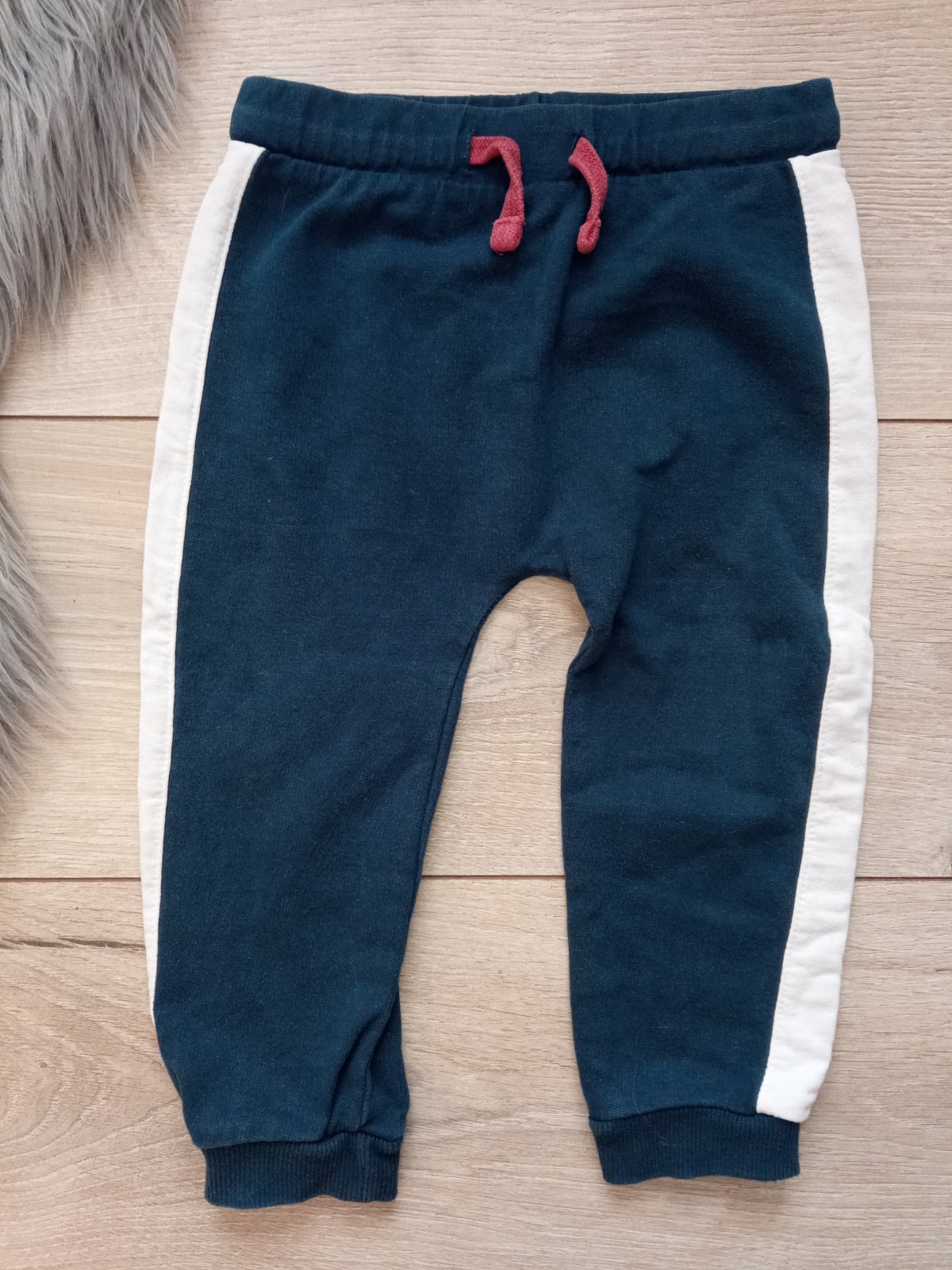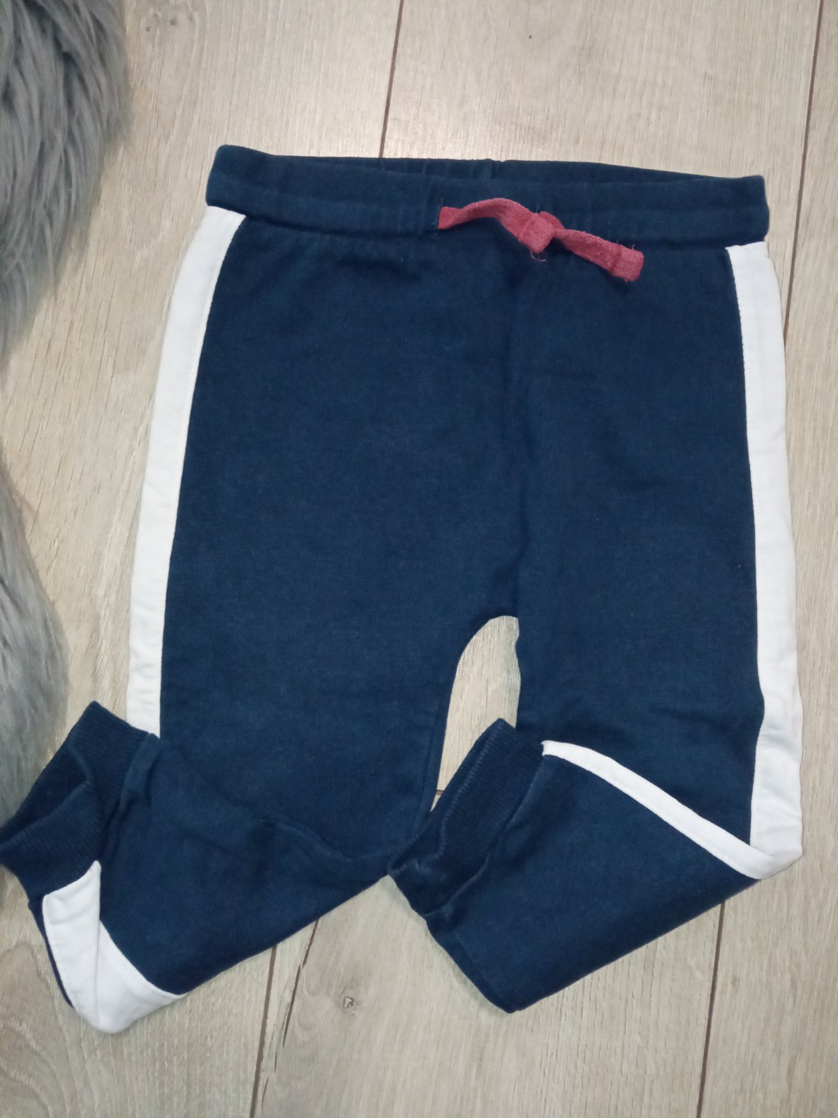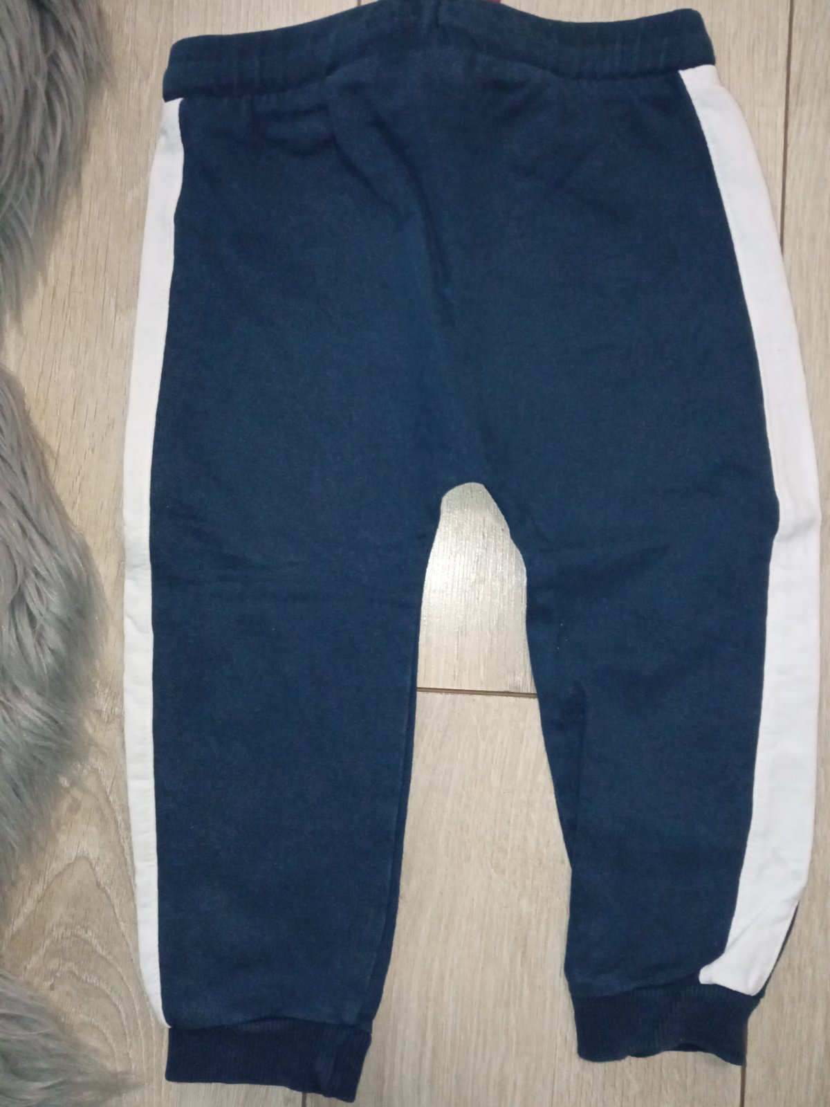 Chlapčenské tepláky, tenké, nie sú elastické, pás na gumu, zaväzovanie na šnúru, materiál:100%bavlna, tmavomodré s bielym pásom na bokoch.