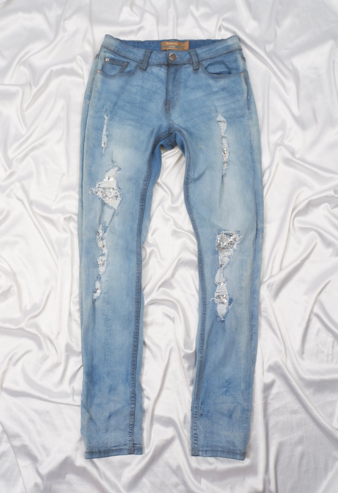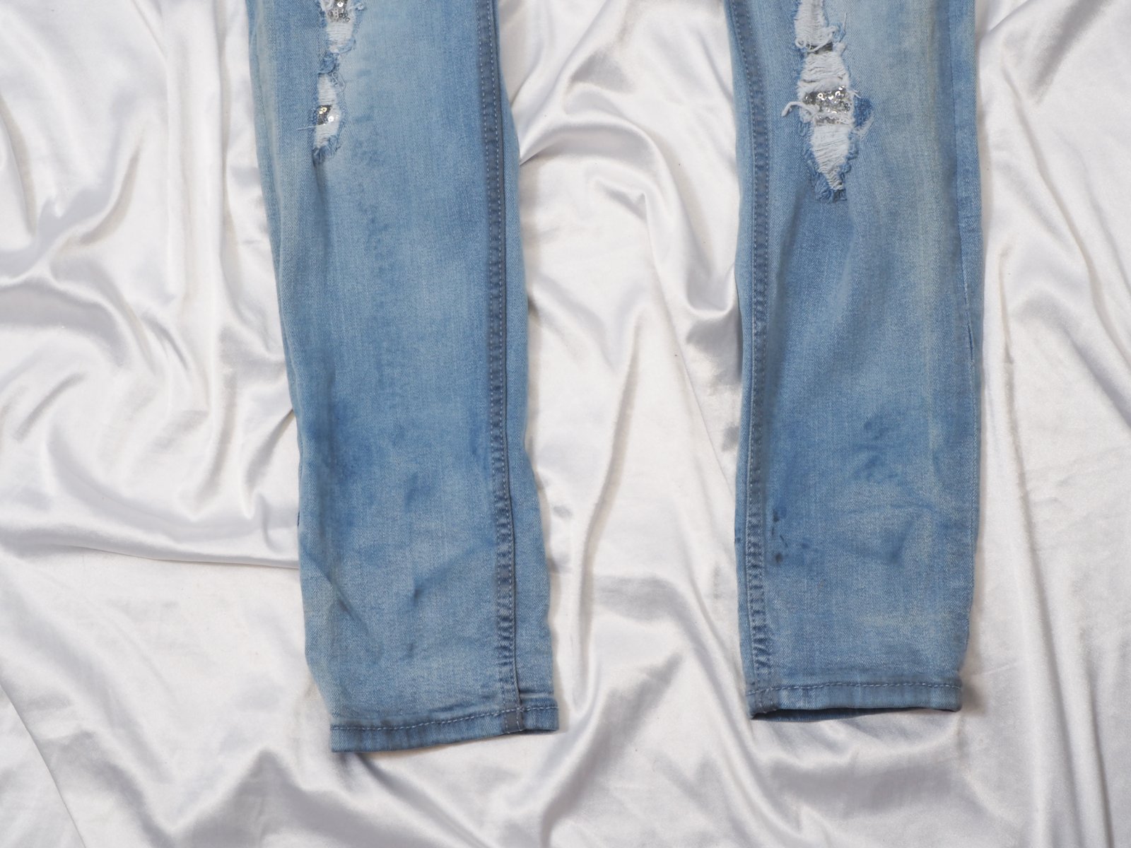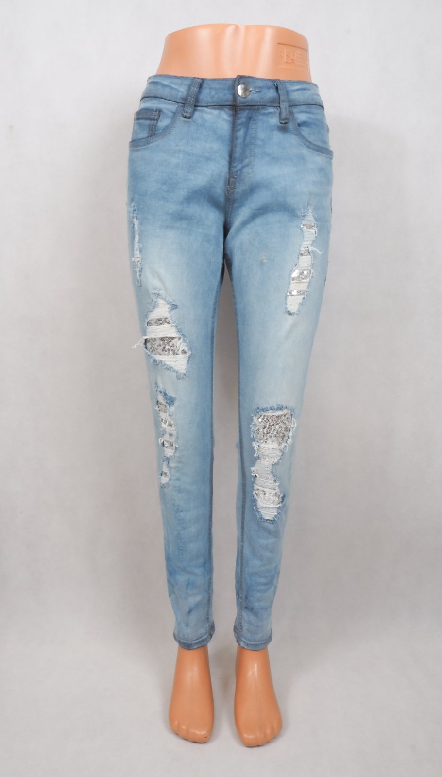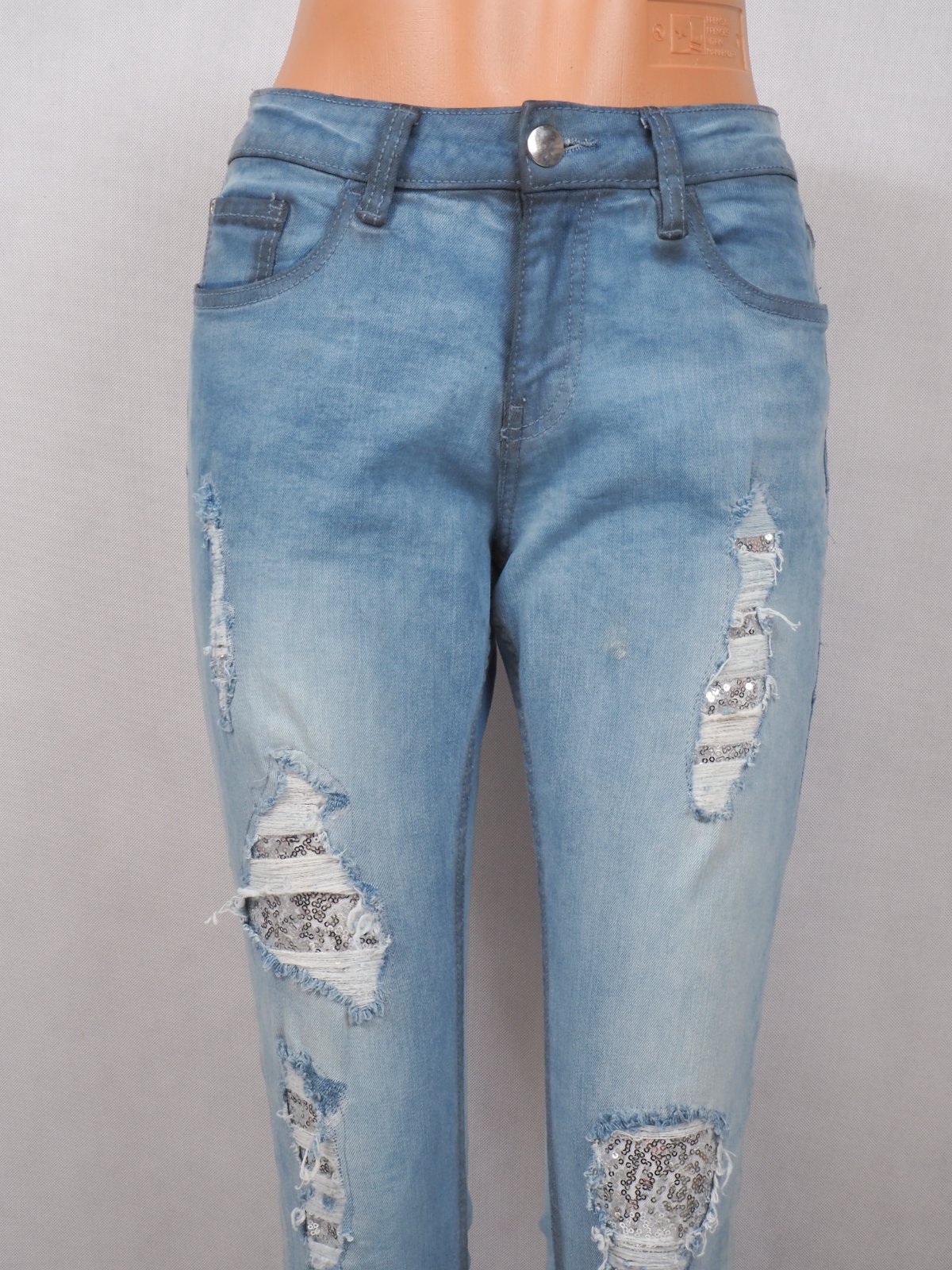 Kvalitné dámske rifle bledomodrej farby, zapínanie na zips a gombík, materiál bavlna, elastan, diery vyplnené flitrovanou látkou, super stav.