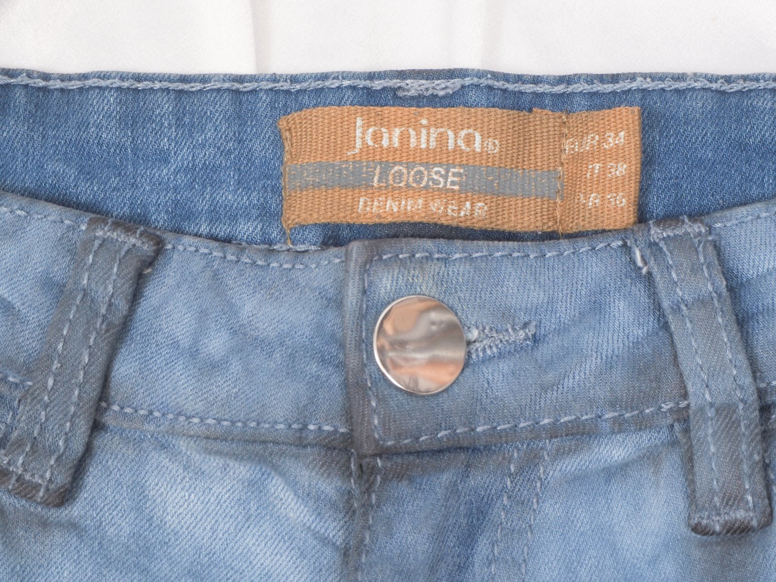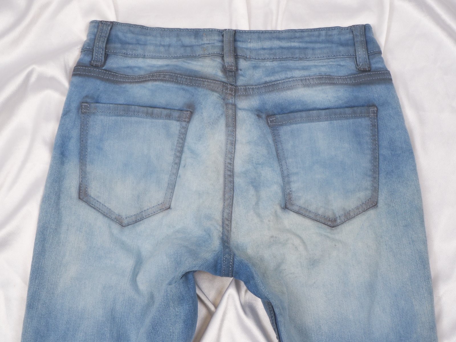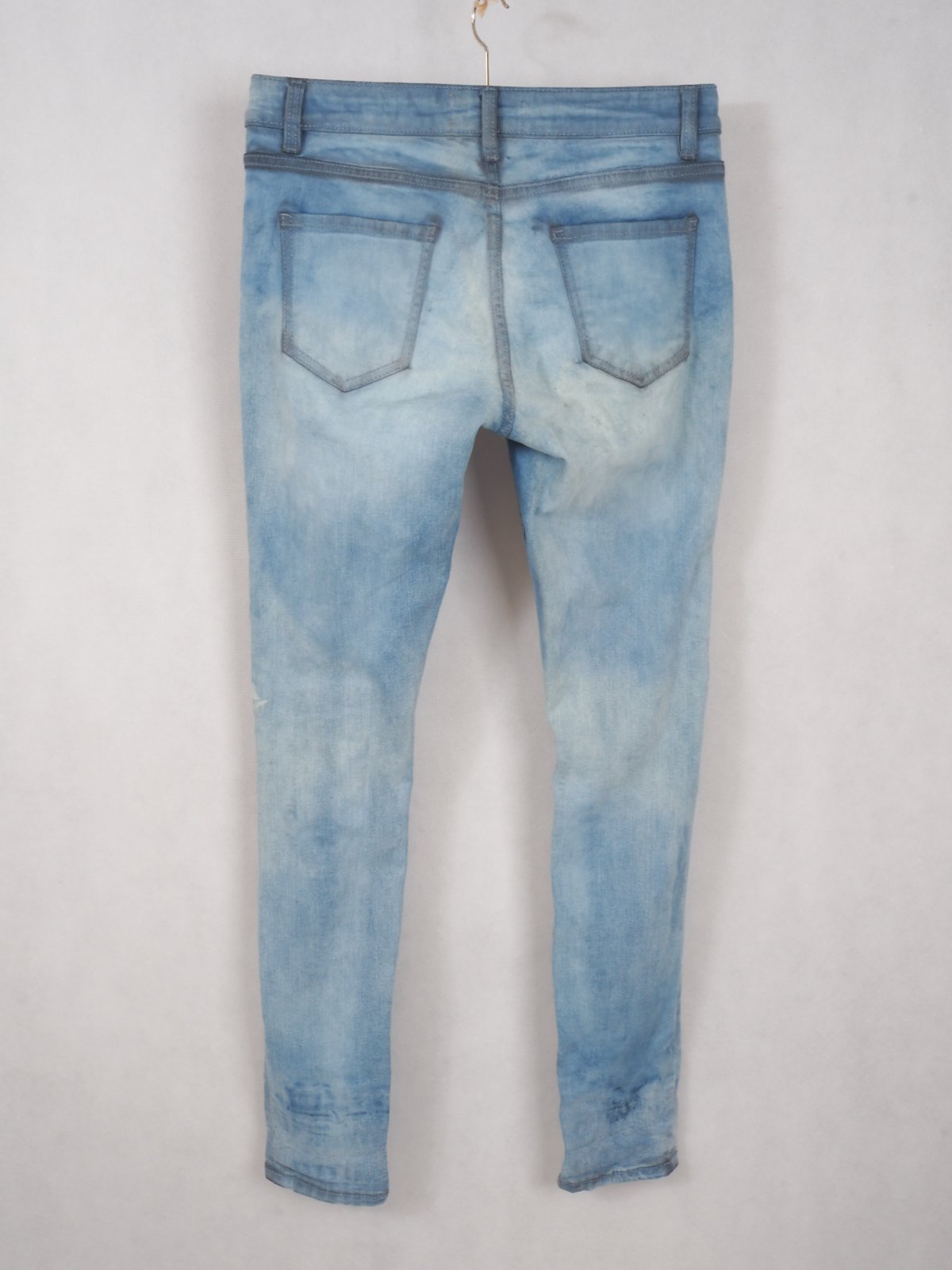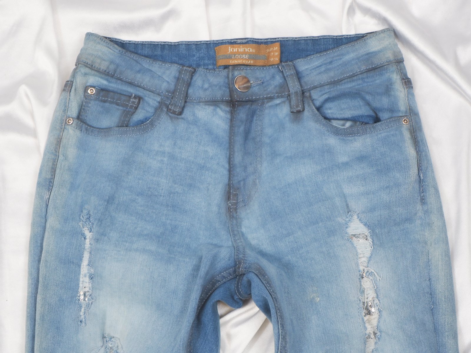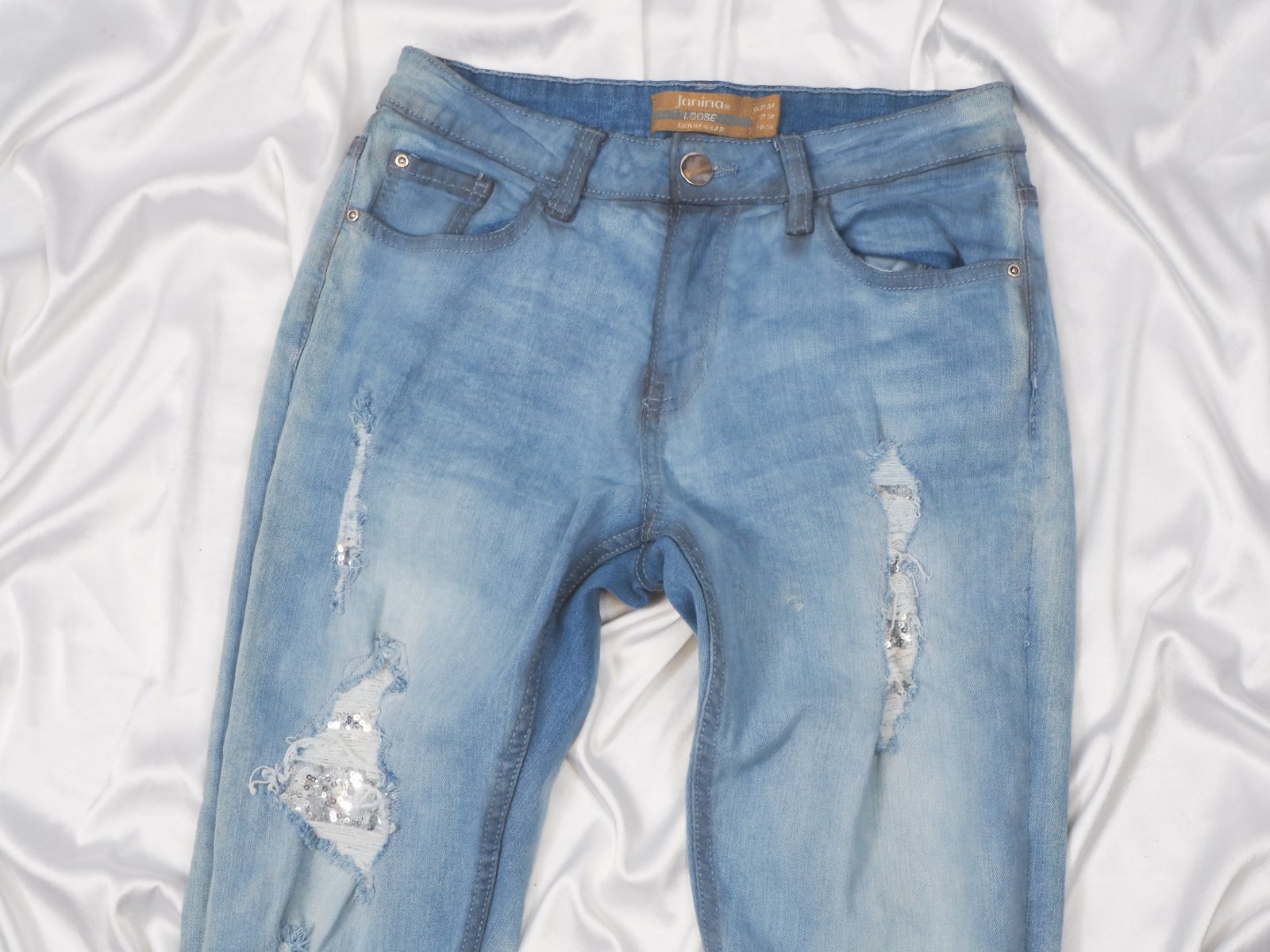 Kvalitné dámske rifle bledomodrej farby, zapínanie na zips a gombík, materiál bavlna, elastan, diery vyplnené flitrovanou látkou, super stav.