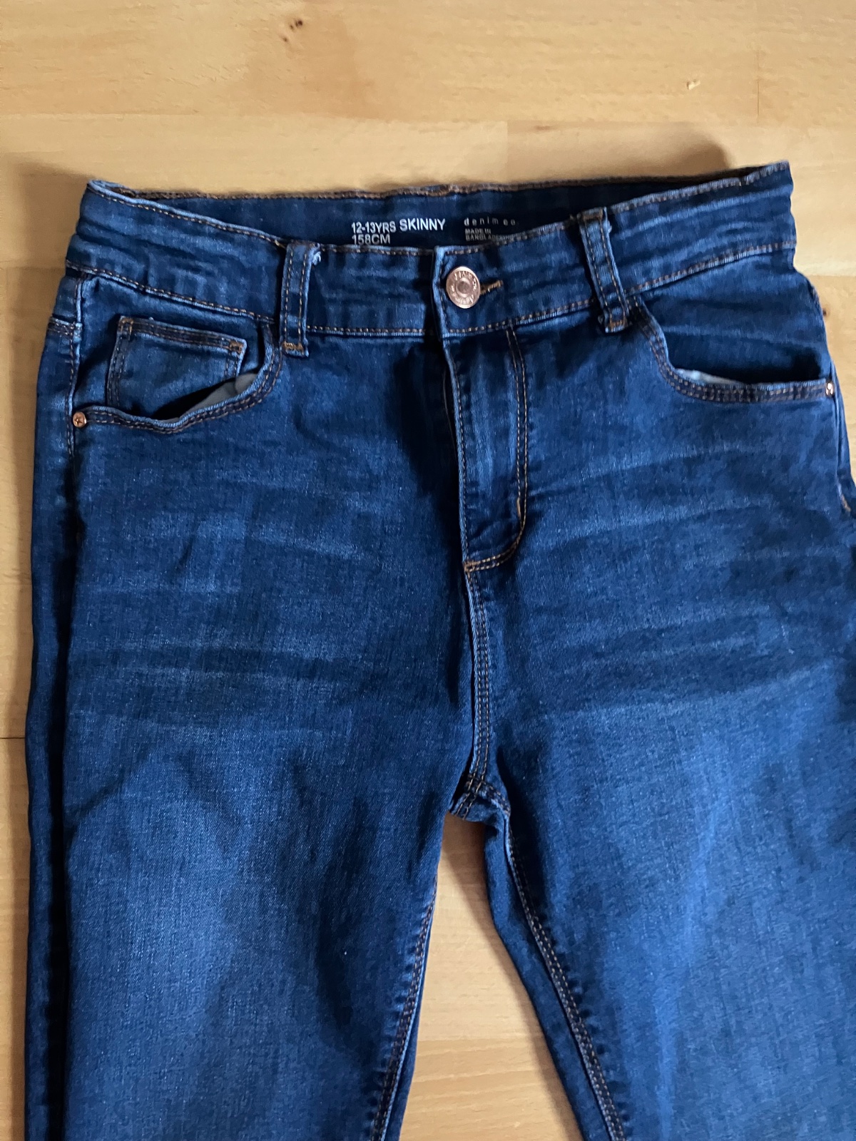 Rifle podšité bavlnenou látkou, elastické, v top stave. Na rifliach sú ozdobné čierne kamienky. Rozmery sú na fotkách.