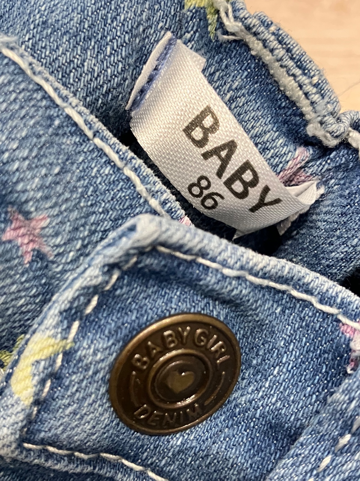 Dievčenské rifle s hviezdami, elastické, nastaviteľná guma v páse, zapínanie na gombík a na zips, materiál 98%bavlna 2%elastan.