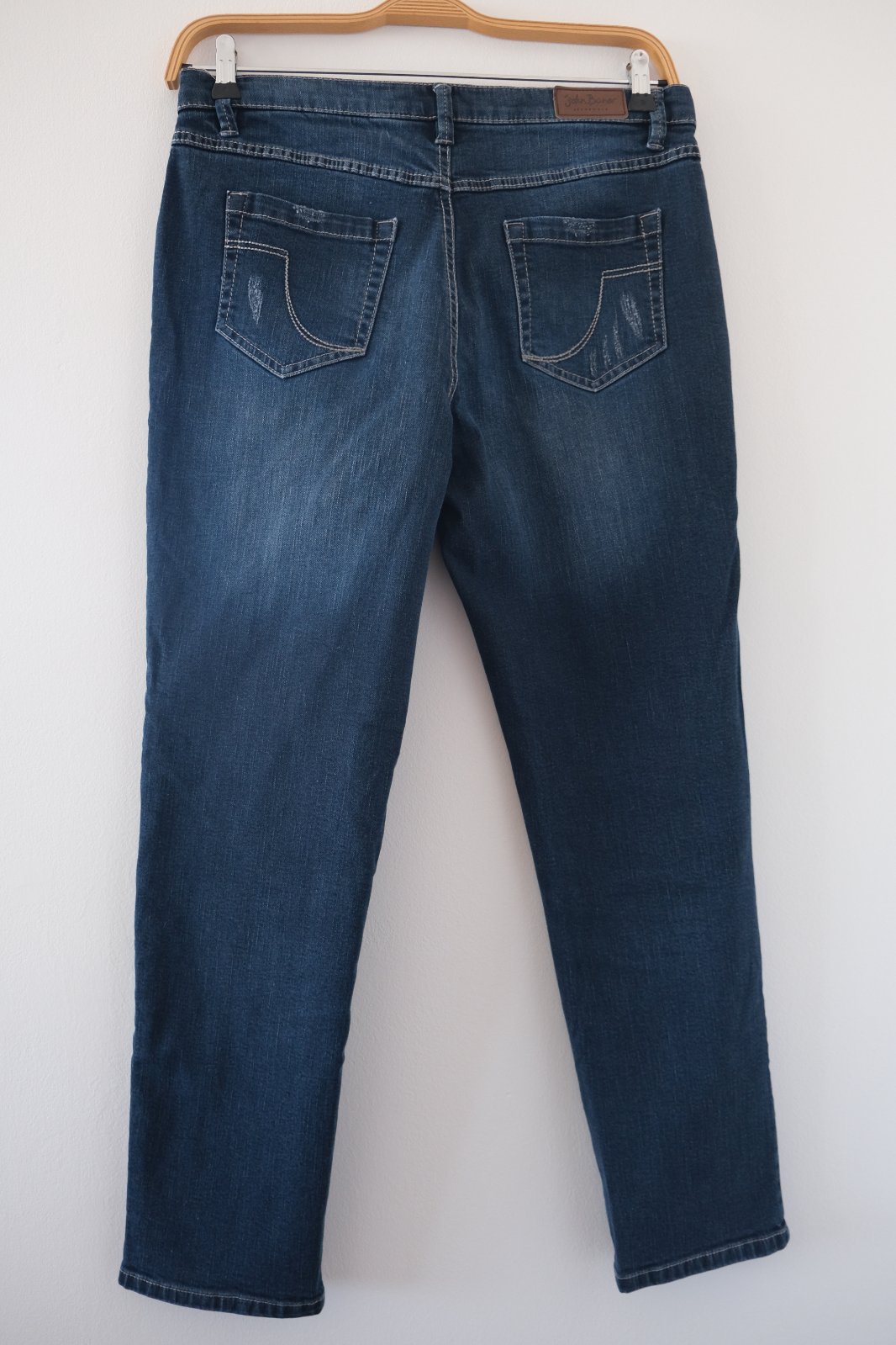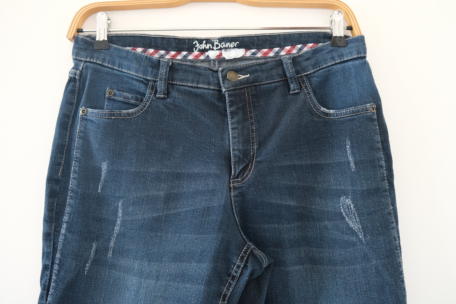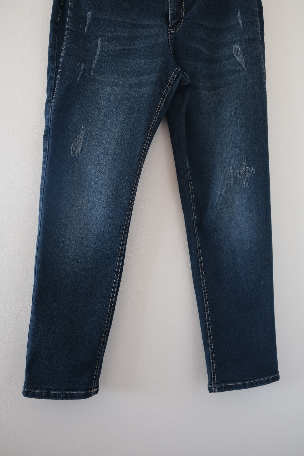 Vysoký pás, voľnejšie cez boky a stehná mierne zúžené nohavice smerom dole, pevnejší denim , roztrhané detaily sú originál.