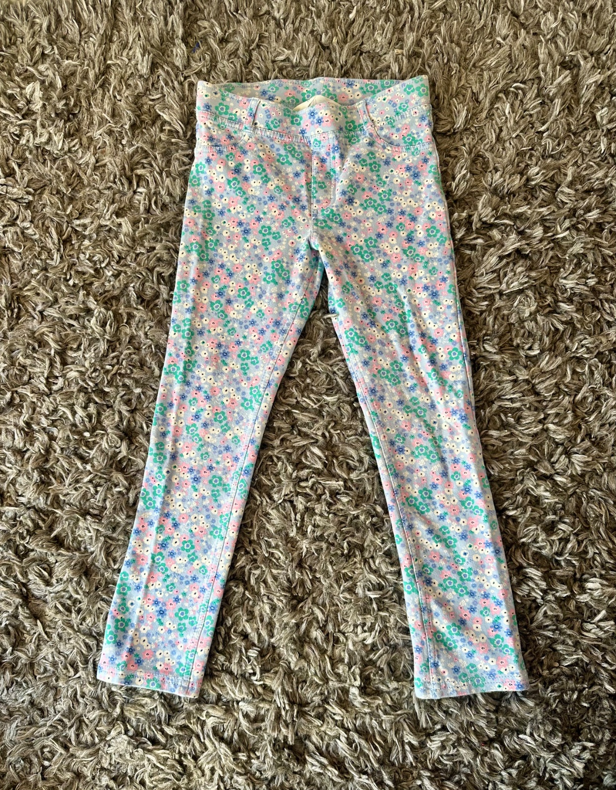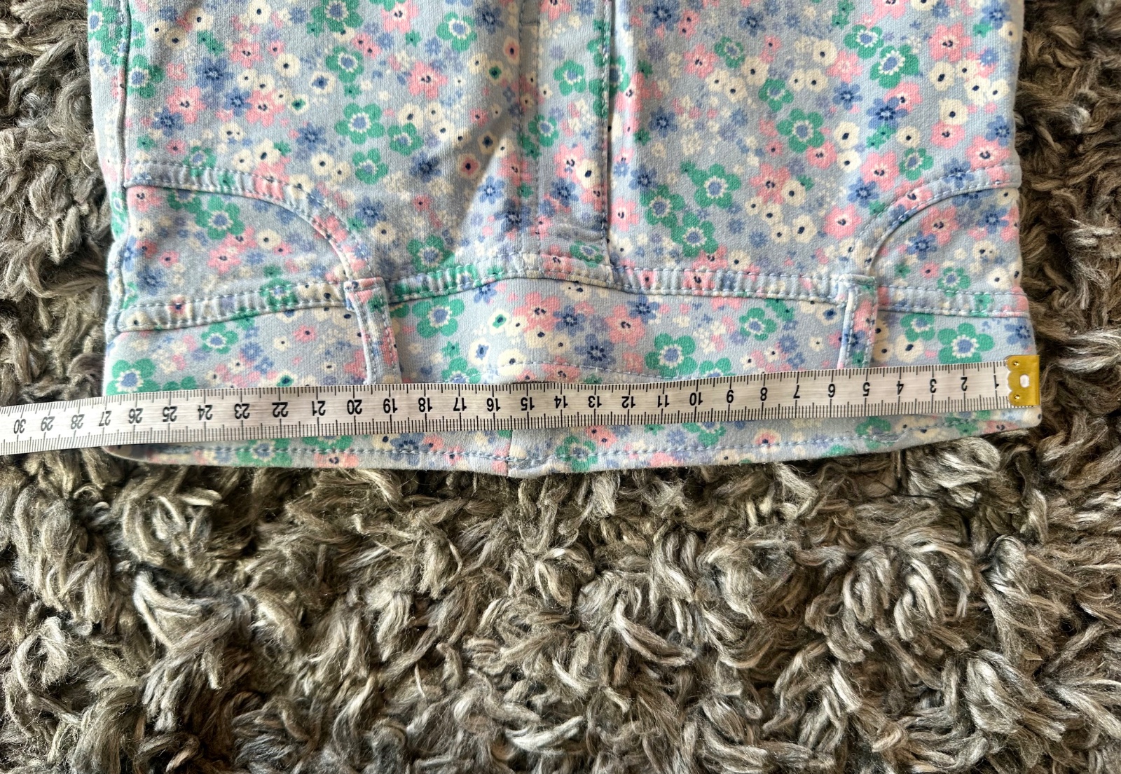 Kvetované, bledomodré natahovacie teplákové legínsy/nohavice. Kolienka nezodreté, nezošívané. Vzadu majú vrecká, rovný strih.