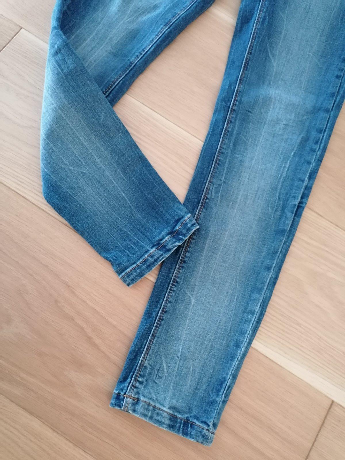Zapínanie na zips a háčik, v páse regulácia gumičkami, vpredu aj vzadu vrecká, farba tmavomodrá, vyšúchaný vzhľad.