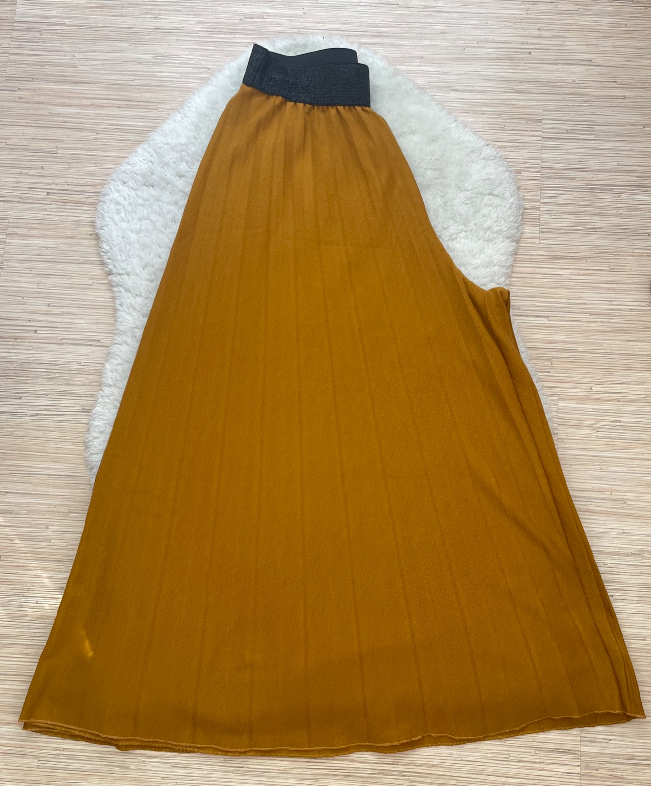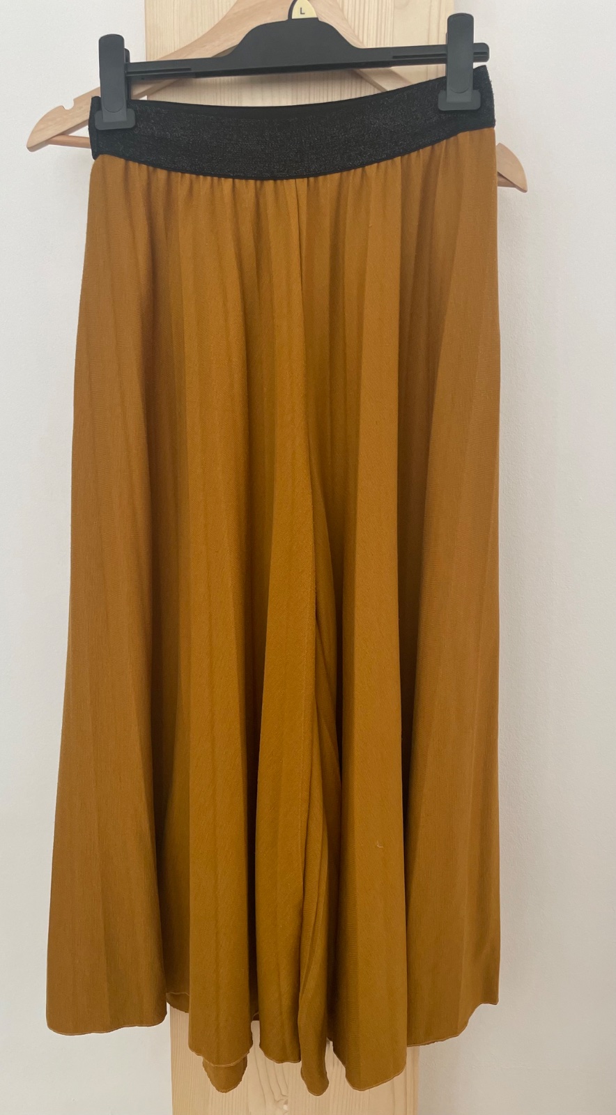 Upletove plisovane sirokanske nohavice na trblietajucu sa ciernu gumu, dlzka midi.