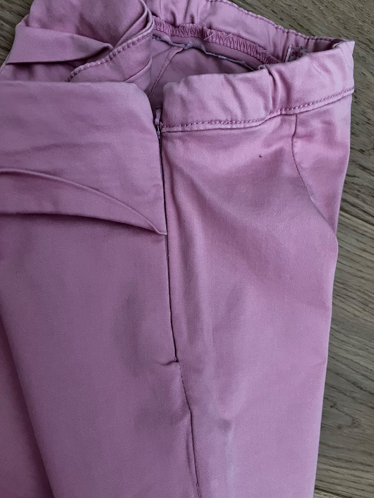 Krásne pestré ružové elastické nohavice vpredu so zipsami na gumičkou v páse. Celková dĺžka 77cm, dĺžka od rozkroku 53cm, pás 2x41cm natiahnuté maximálne.