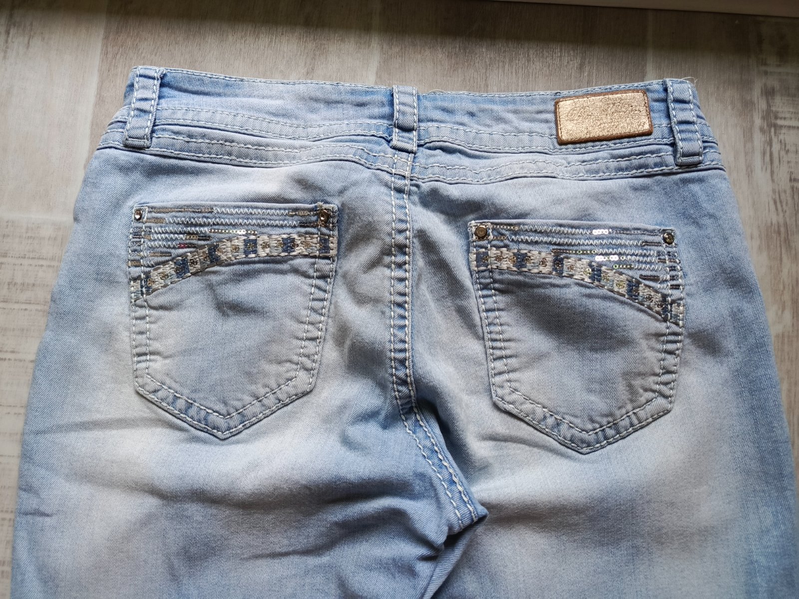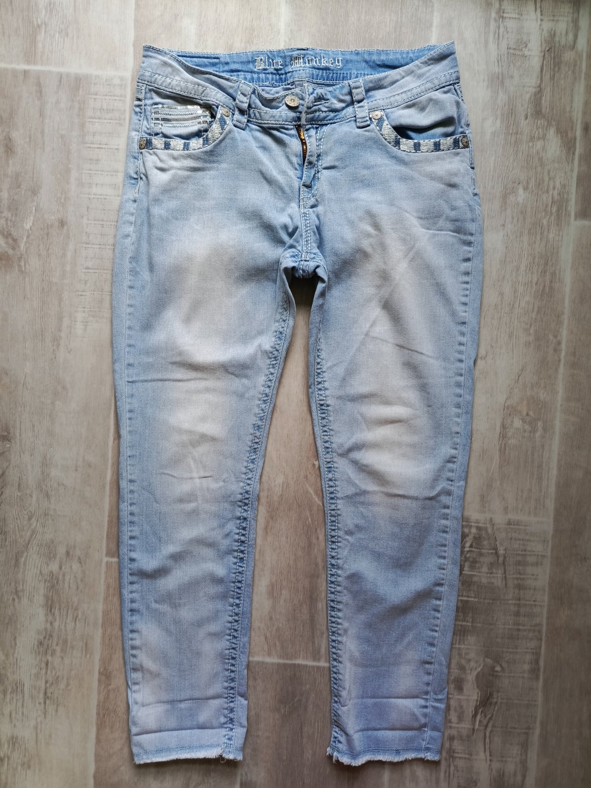Bledomodré rifle s vypraným efektom, bez poškodenia, výborný stav. Dĺžka 105 cm.