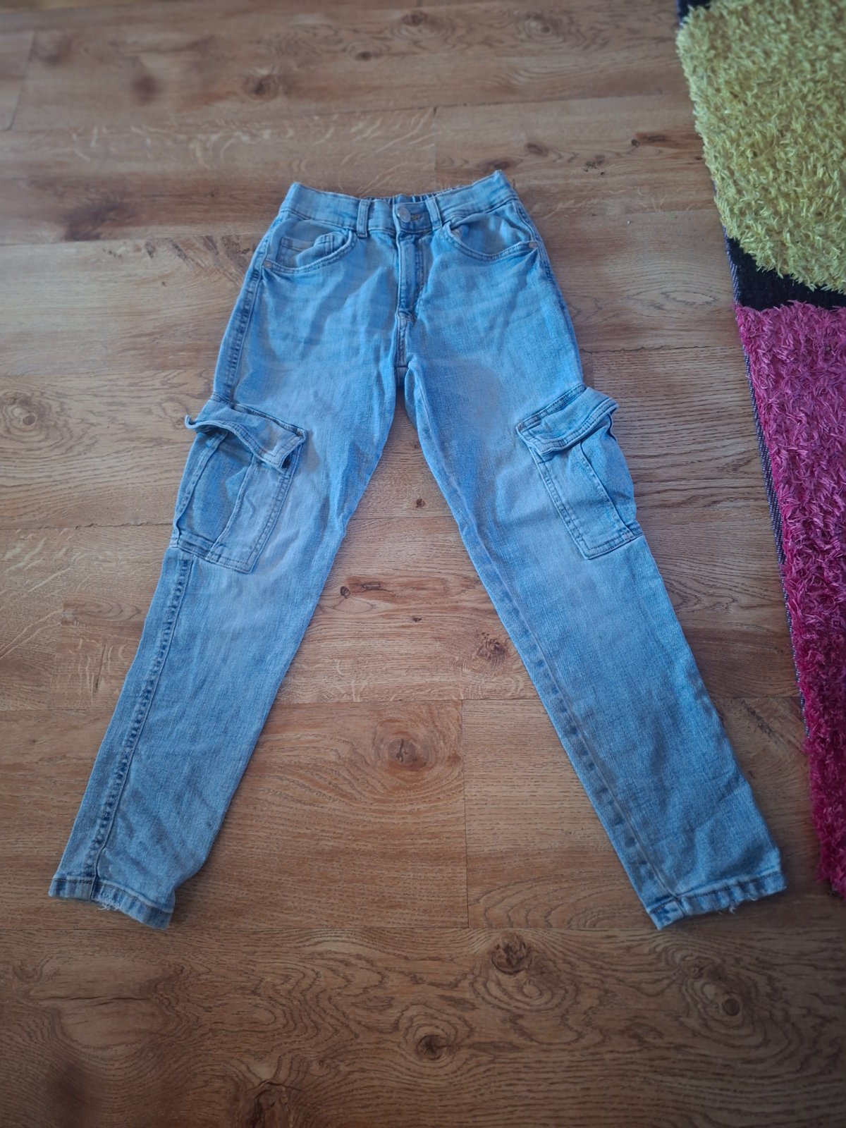 Pekný nosený stav. Diery na kolenách sú podšité, dierka pod vreckon nie je podšitá, prekrýva ju vrecko. Sú užšieho strihu.