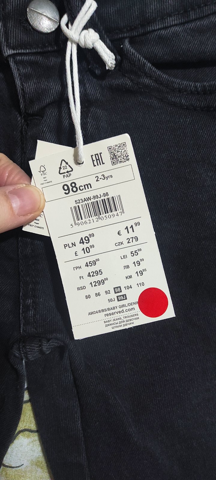 Perfektne rifle pre malu paradnicu bez poskodenia ako nove. Rozmery flzka 53, od rozkroku 36, sirka v pase nastavitelna.