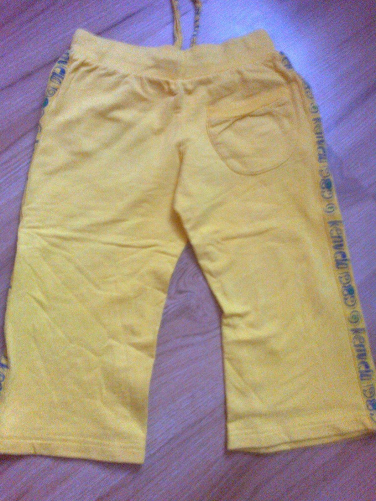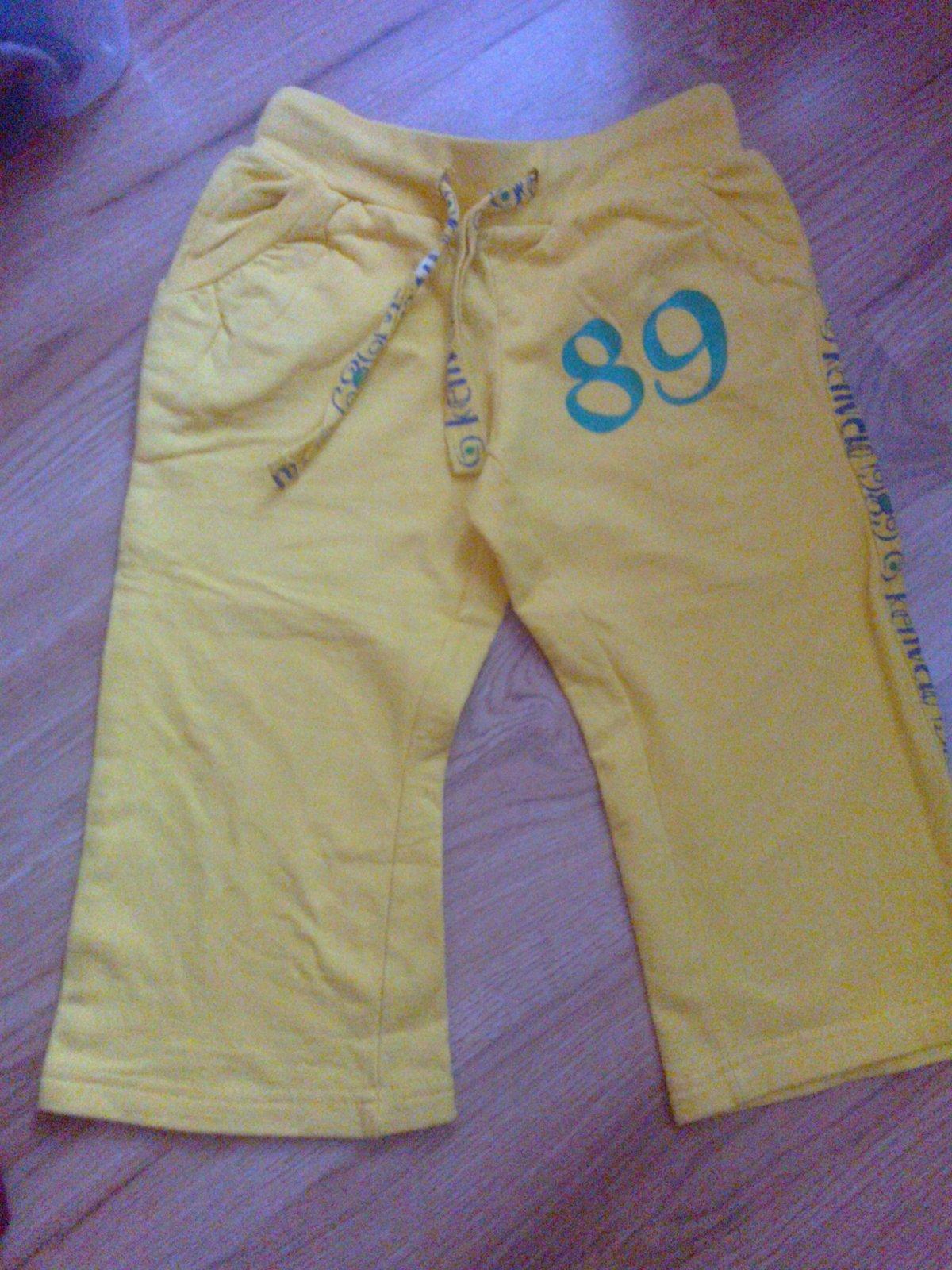 1x oblecene teplaky znacky Kenvelo. Vel.2-3 roky. Dlzka:47cm. Farba je krajsia-silno zlta. Cena:1€. V bazariku mam vela veci 1x oblecene, alebo len vyskusane. Platba vopred na ucet alebo osobny odber ZA.