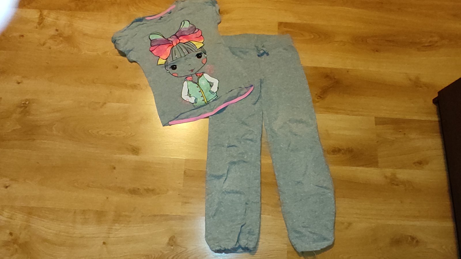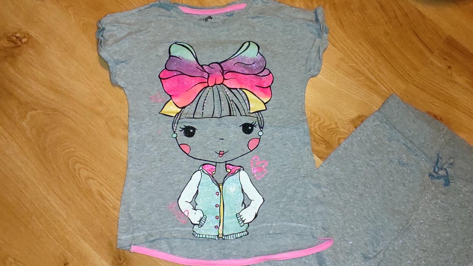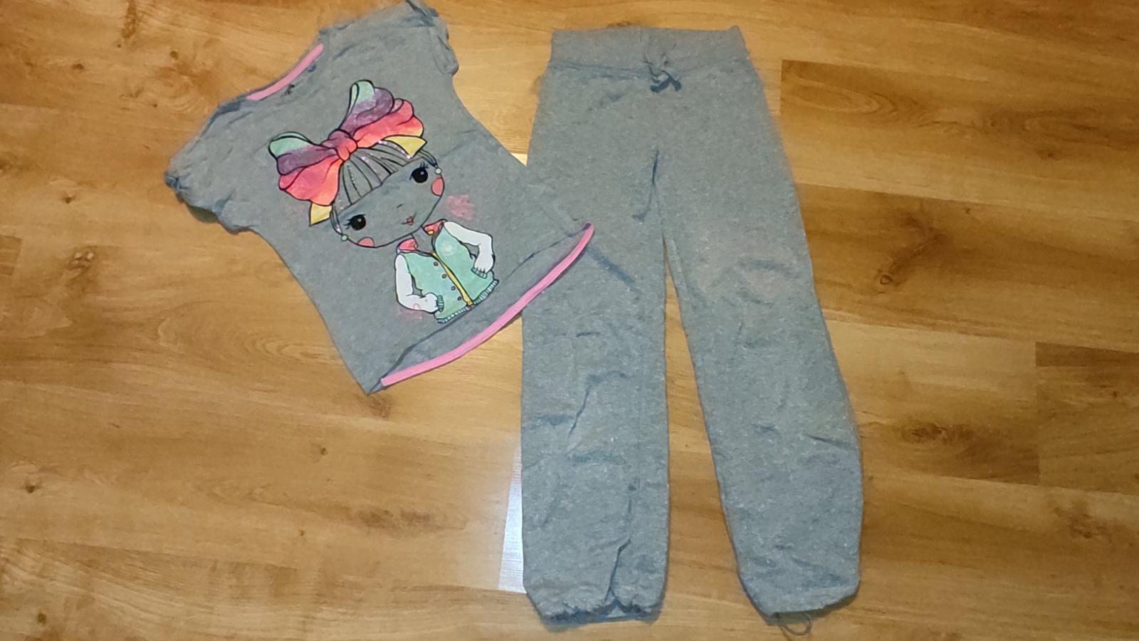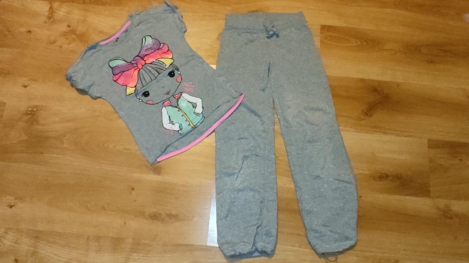Ponúkam na predaj krásne tepláky pre dievča. Vhodné aj na tsv, nie sú hrubé, dole sa dajú stiahnut. Sú nosené ale bez akýchkoľvek poškodení. Celé sú mierne trblietavé, nedá sa odfotiť. Bavlnené. K nim aj bavlnené tričko, nosené ale stále pekne bez poškodení. Cena 6 eur.