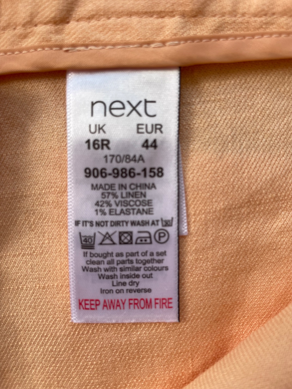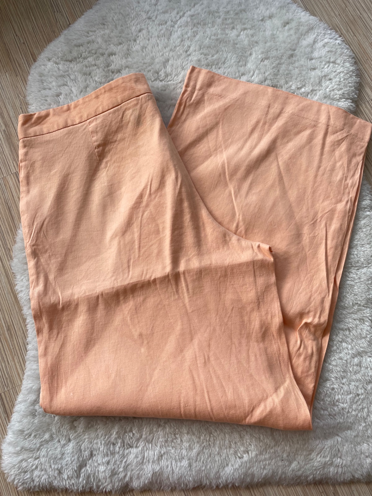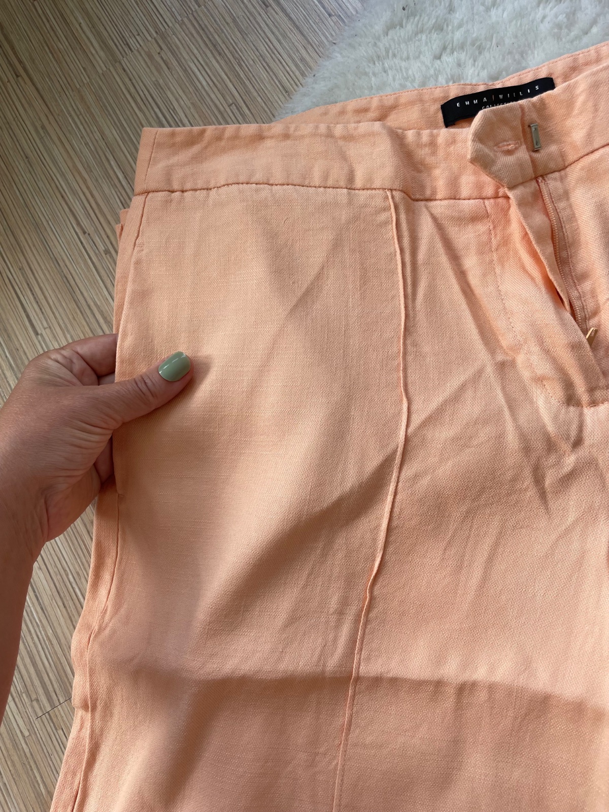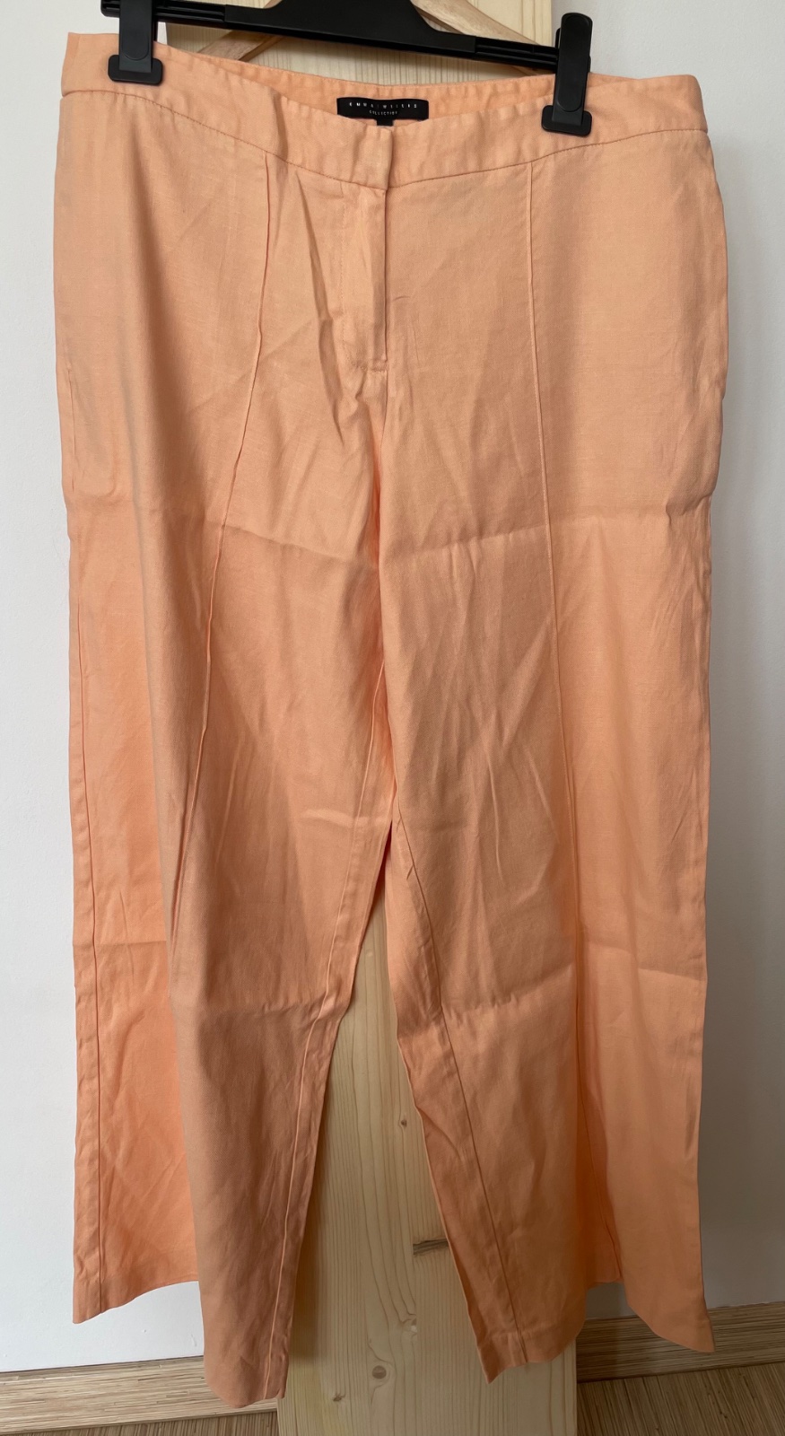 Lanove siroke nohavice Next v spolupraci s Emm Willis, v bocnymi vreckami, na zips a skryty patent, nohavice presivane po celej dlzke. Material lan, viskoza, elastan.