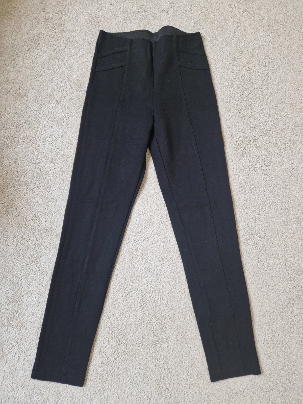 Krásne čierne nohavice s pukmi, 134, Zara. Ako nové. Pás guma, prestrih šikmo. Príjemné, elastické. Pás 50cm, dĺžky 74/54cm.
