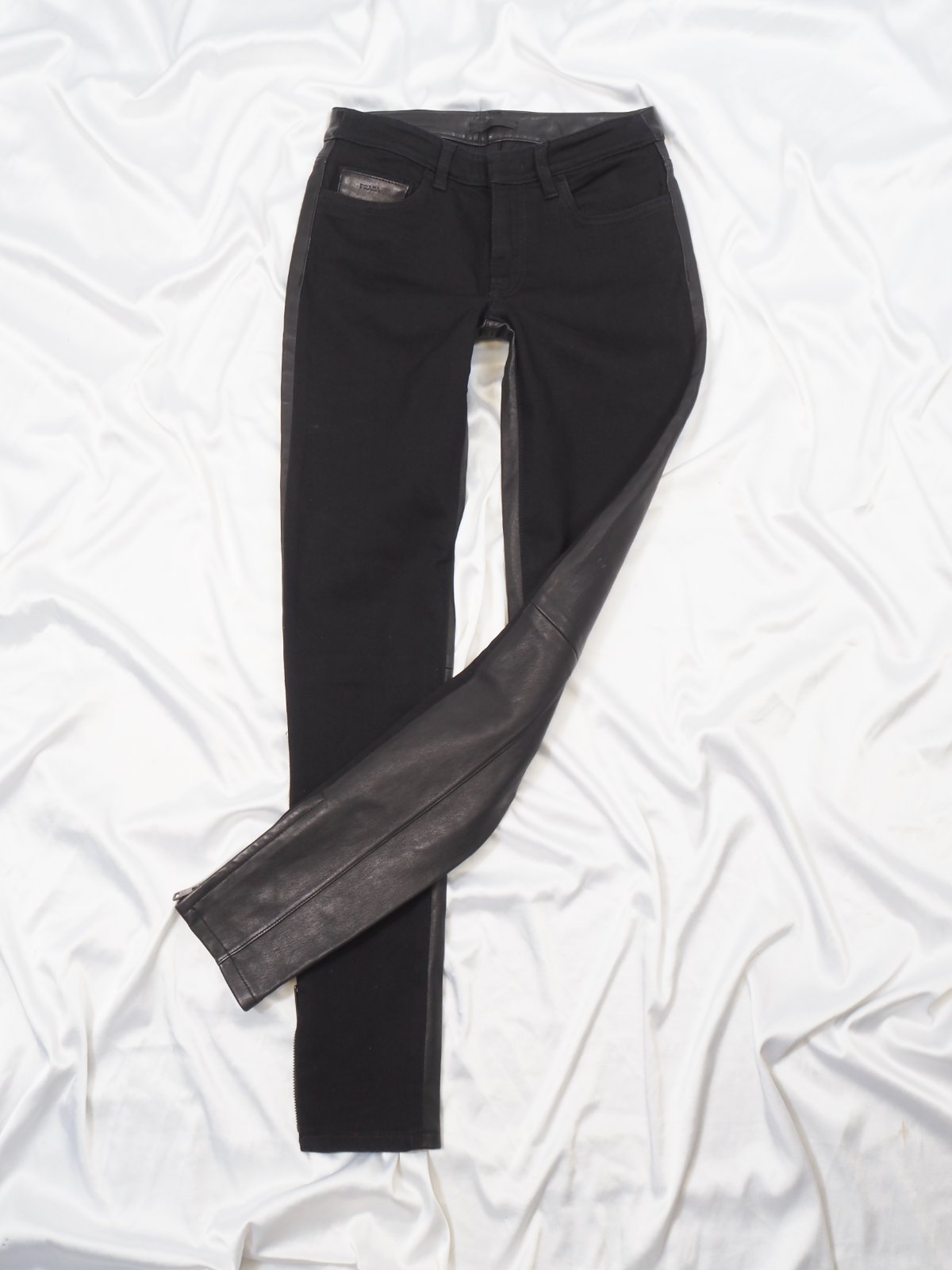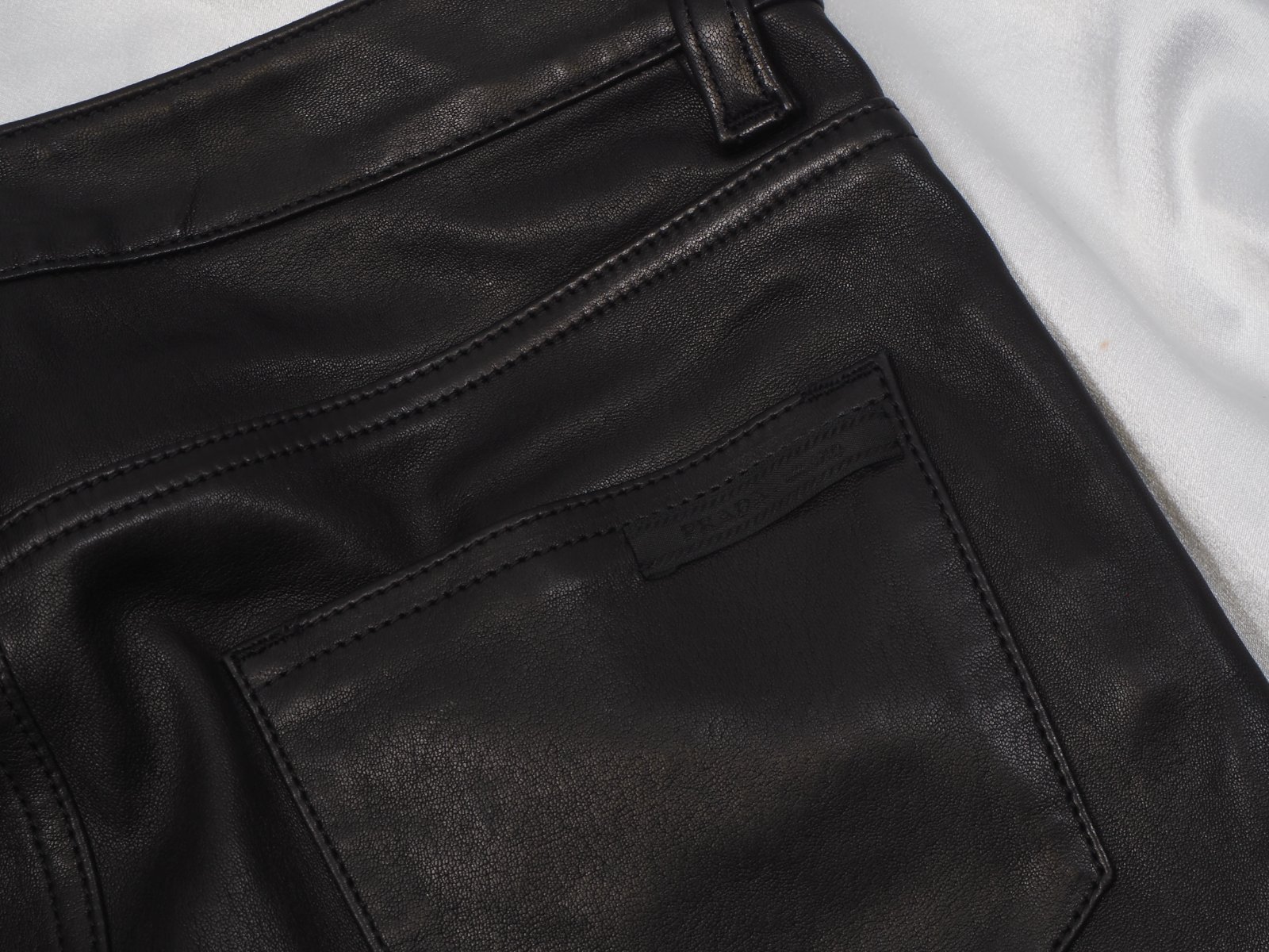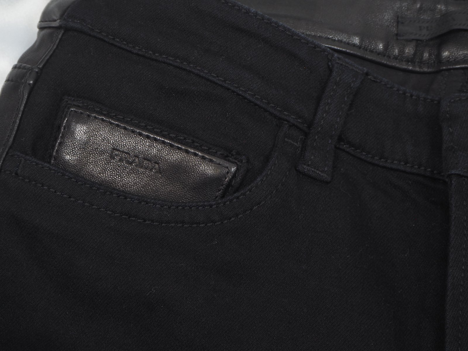 Luxusné čierne strečové rifle s koženým zadným dielom, na nohách zipsy po bokoch, materiál 98% bavlna, 2% polyuretán, zadný diel pravá jahňacia koža, nové bez visačky....pc 799 €