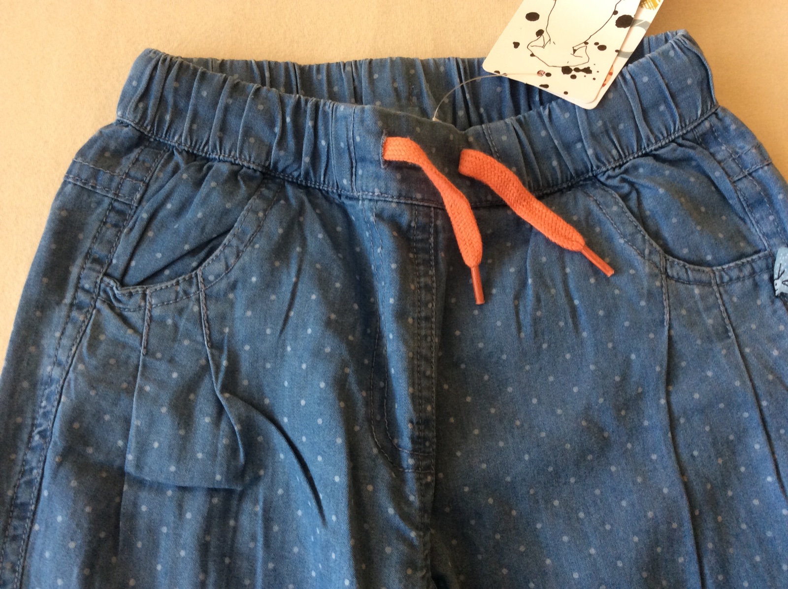 Nové s visačkou, v páse na gumu a na šnúrku, na spodu manžetky, vzor bodočky, krásne, PC: 20,90 eur, kupované v zľave.