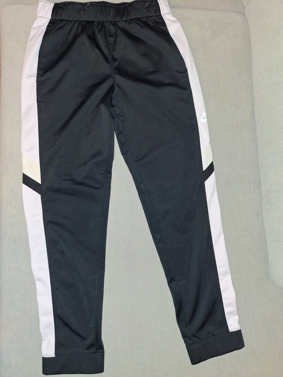 Tepláky málo nosené, čierne s bledým pásom s nádychom ružovej farby. Dĺžka 82cm. Bez závad a poškodení.