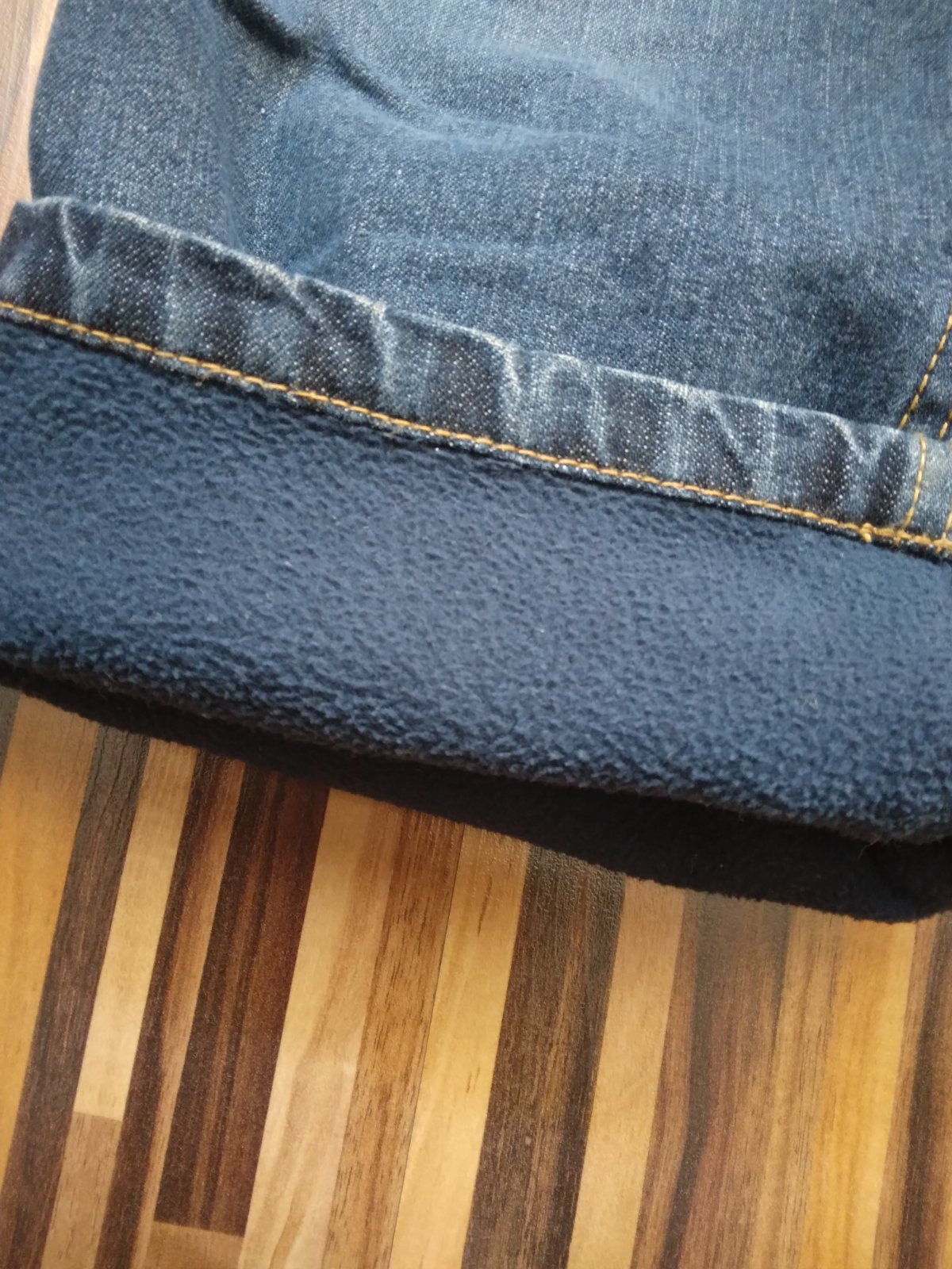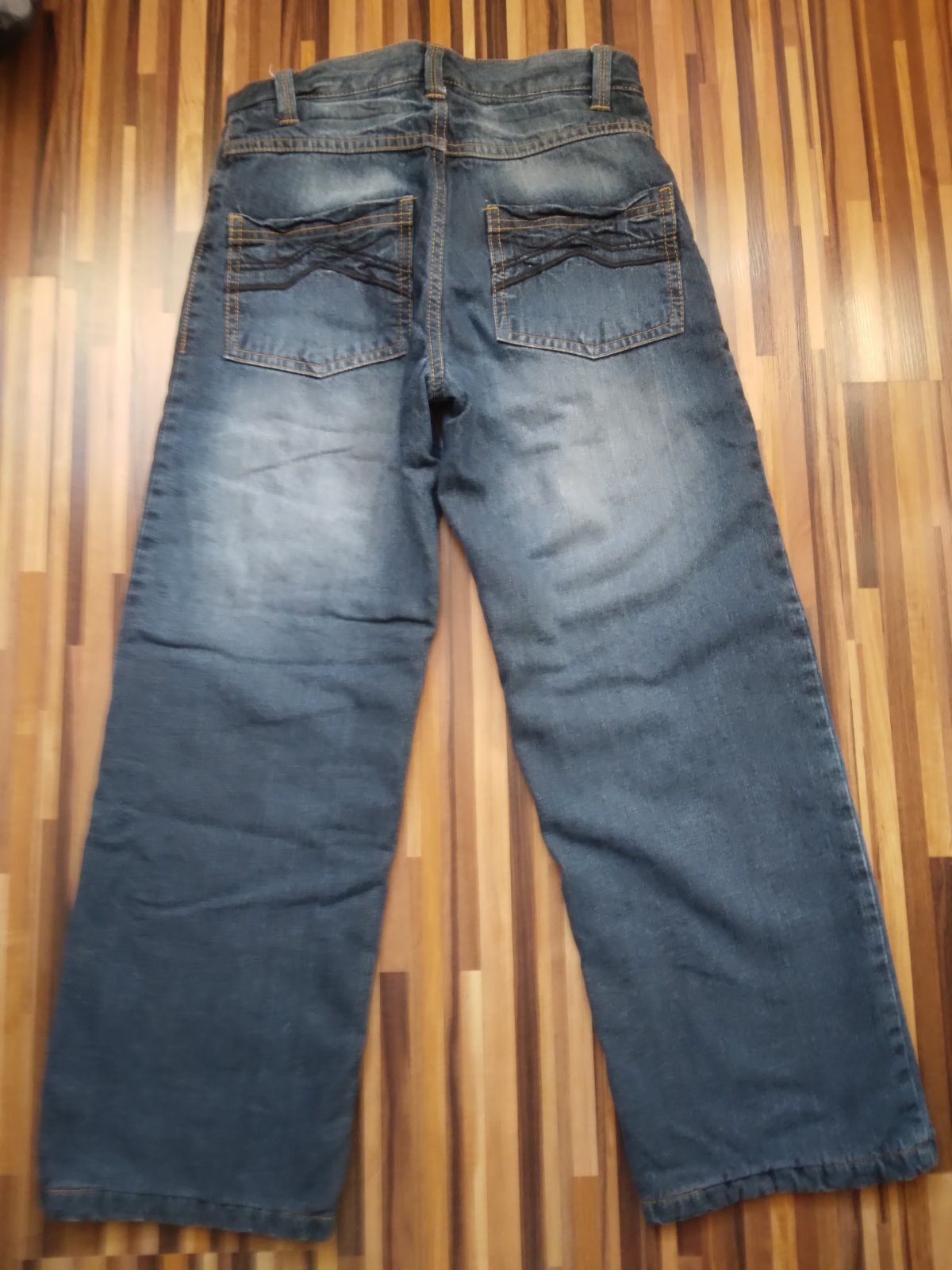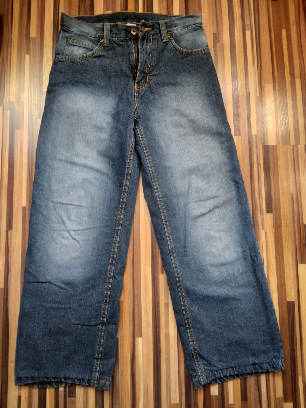 Širšie rifle bez poškodení,zateplené flísom.Dĺžka 80cm,obvod pása 2x32cm-nedá sa regulovať.(k6)