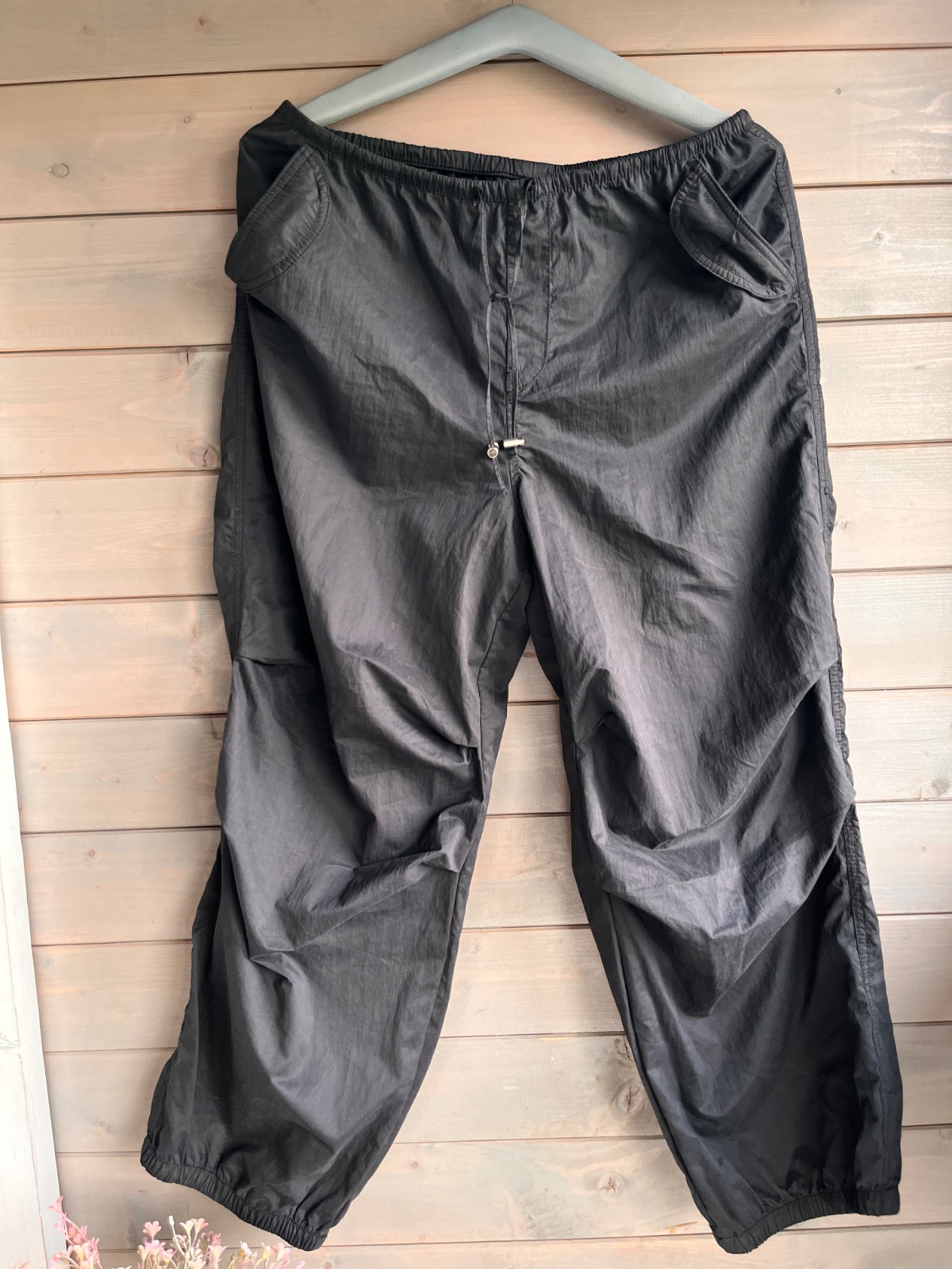 Sú to voľné nohavice, sú vporiadku okrem jednej gumičky na ľavej strane nohavíc ktorá sa roztrhla no je tam uzol okrem toho sú bez poškodenia. Na všetkých vreckách +nohy a pás sú gumičky. Okrem kap...