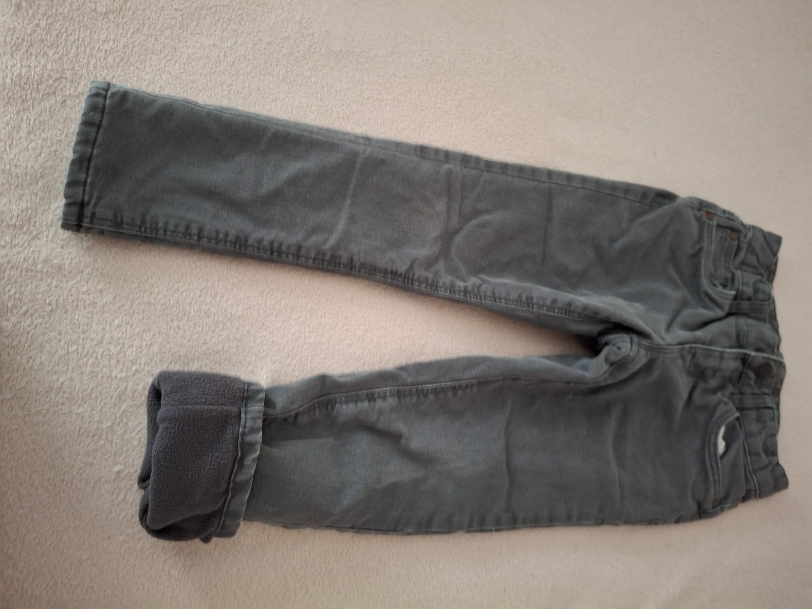Vyteplene flisom. Trochu osuchane kolena. Dlzka 70 cm, od rozkroku 50 cm, pas nastavitelny.