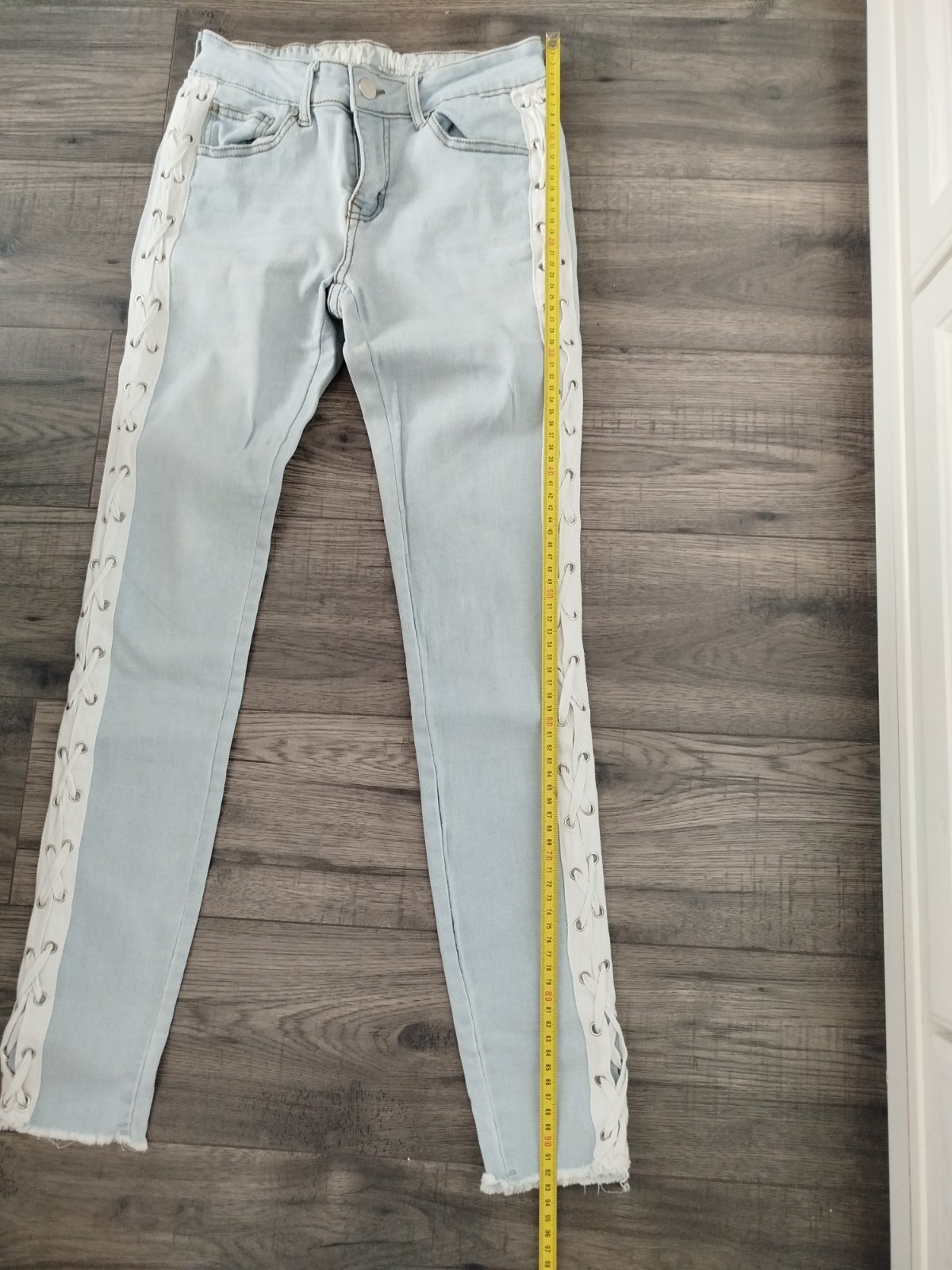 zachovalé nepoškodené rifle so šnurovanim naboku, dcere sú už úzke, miery na foto