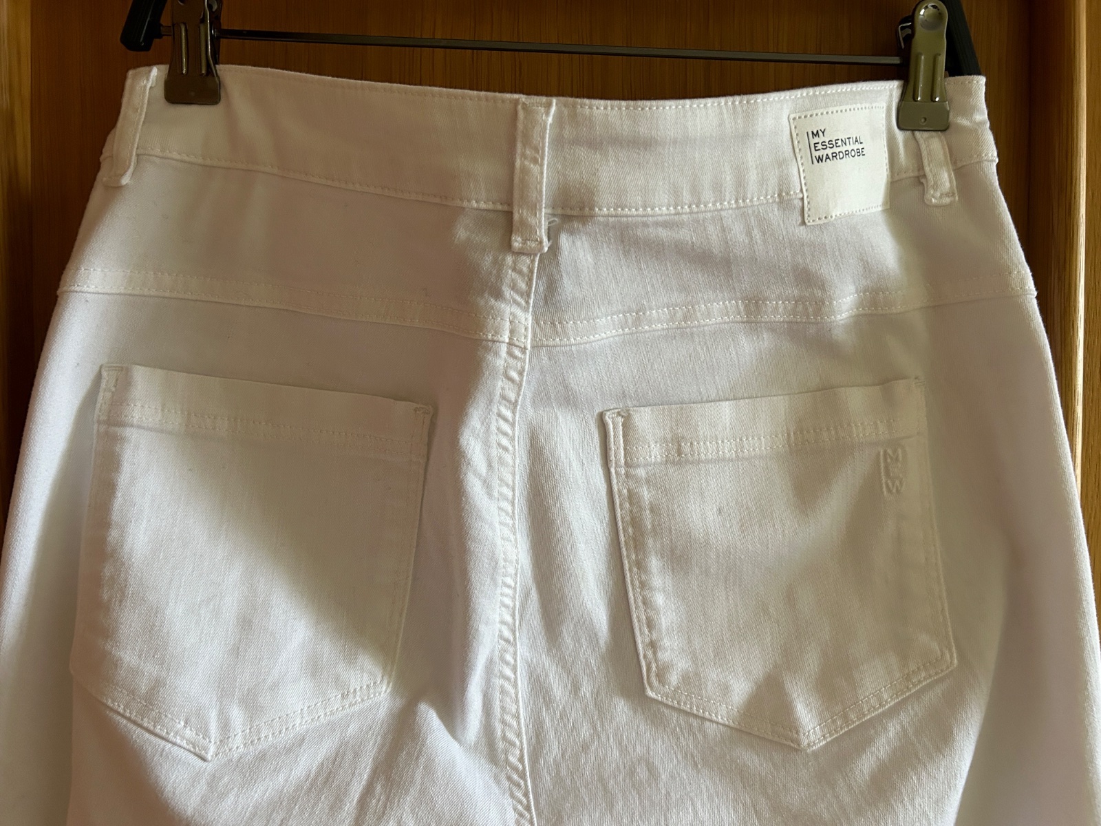 Predám biele rifle do pásu kvalitnej dánskej značky MEW - My Essential Wardrobe. Veľkosť L/ riflová 32-ka, rozmery: pás 41x2 cm, dĺžka 108 cm. Materiál: 90% organická bavlna, 8% polyester, 2% elastan. Vysoký pás, rovný strih. Kto pozná túto modernú značku vie, že ceny džínsov sa pohybujú od 100 EUR. Veľmi pohodlné na nosenie. BA alebo poštou+poštovné.