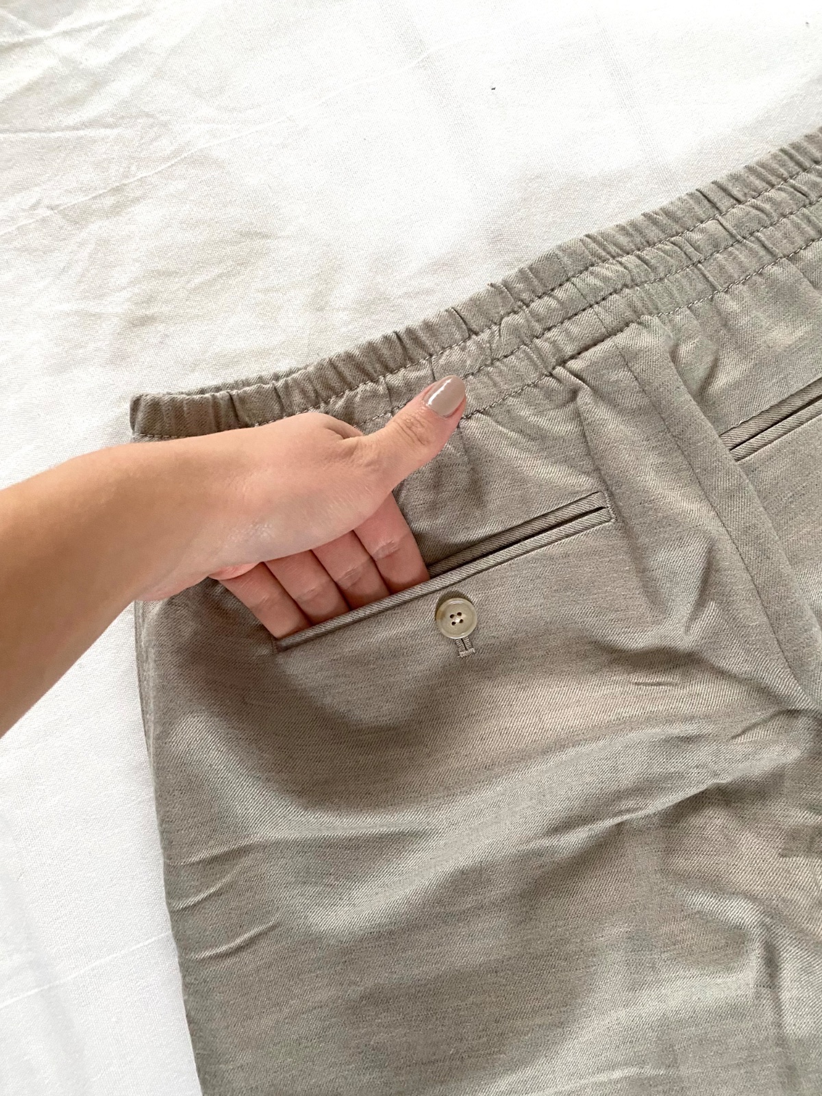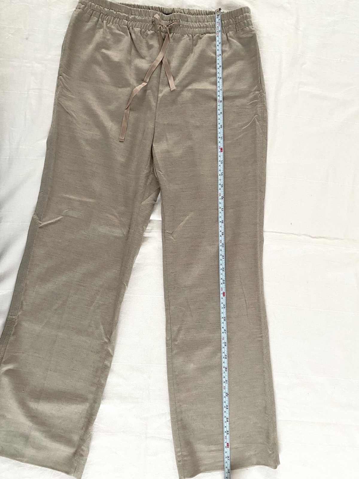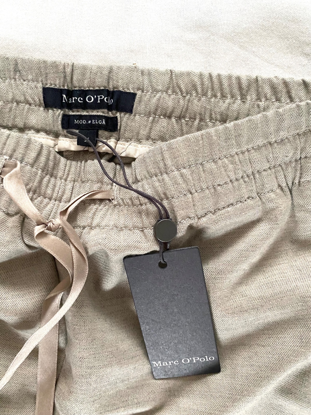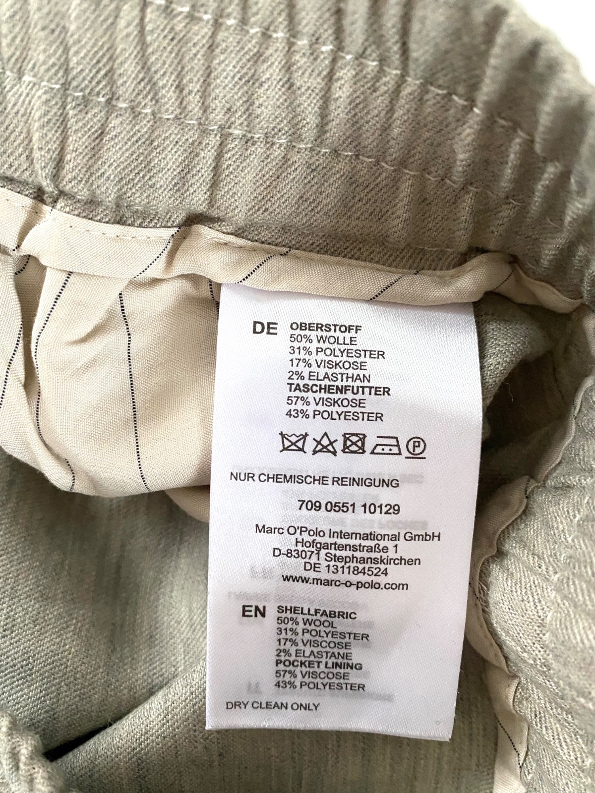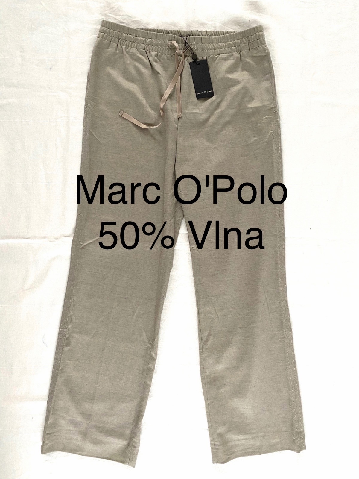 Béžové vlnené nohavice Marc O'Polo, nové s visačkami. Nohavice majú široký elastický pás a ladiacu stuhu. Po bokoch a vzadu sú vrecká. Nohavice majú rovný strih a farba je krásna, elegantná béžová. Materiál je 50 % vlna, 31 % polyester, 17 % viskóza a 2 % elastan, vďaka čomu sú elastické. Nohavice sú veľmi všestranné. Vyzerajú skvele so športovou mikinou s kapucňou alebo bielym tričkom. Veľkosť na visačke je 36 a všetky miery sú na fotografiách. Cena na visačke je 129,90 €.