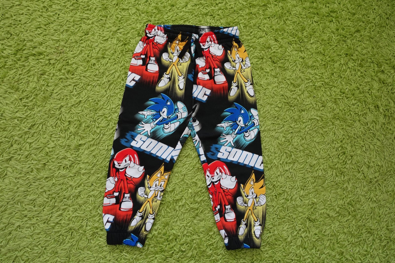 Predám tepláčiky mierne podteplené s krásnymi obrázkami Sonica. Mali sme ich 1x, ale sú top stav. Žiadne fľaky, diery, žmolky. Dĺžka tepláčikov je 59 cm a šírka pásu v kľude je 24,5 cm. Šnúrka sa dá plne zatiahnuť. (V10)
