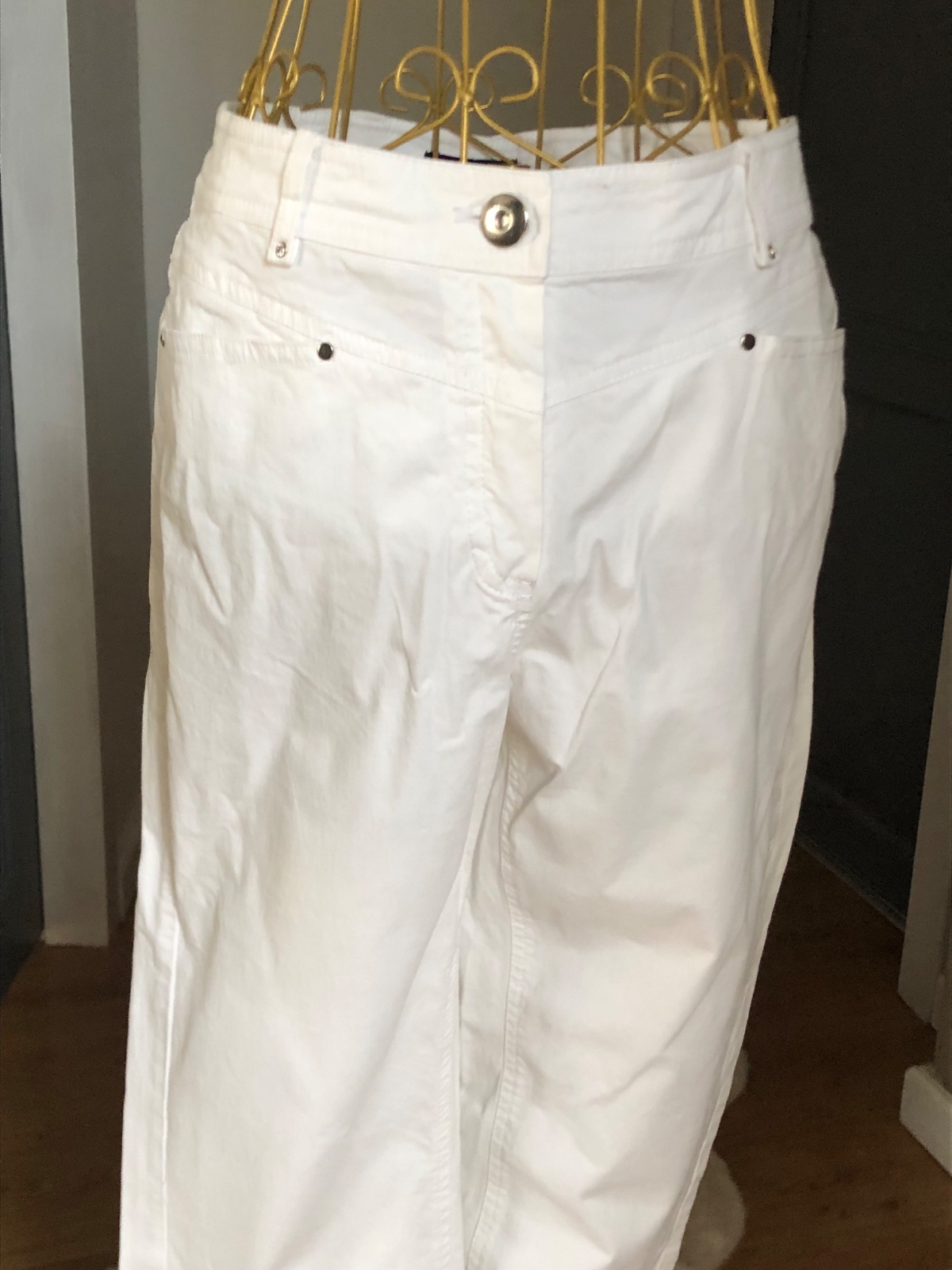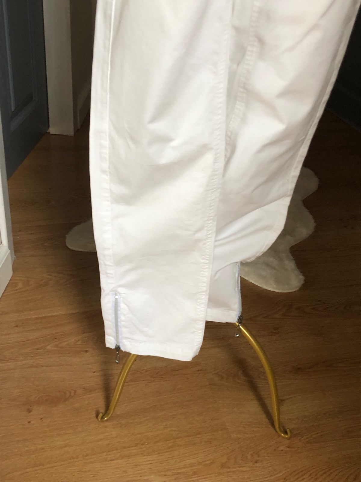 Kvalitné biele nohavice, dole úzke so zápasmi, zapínanie na zips a gombík, super stav.