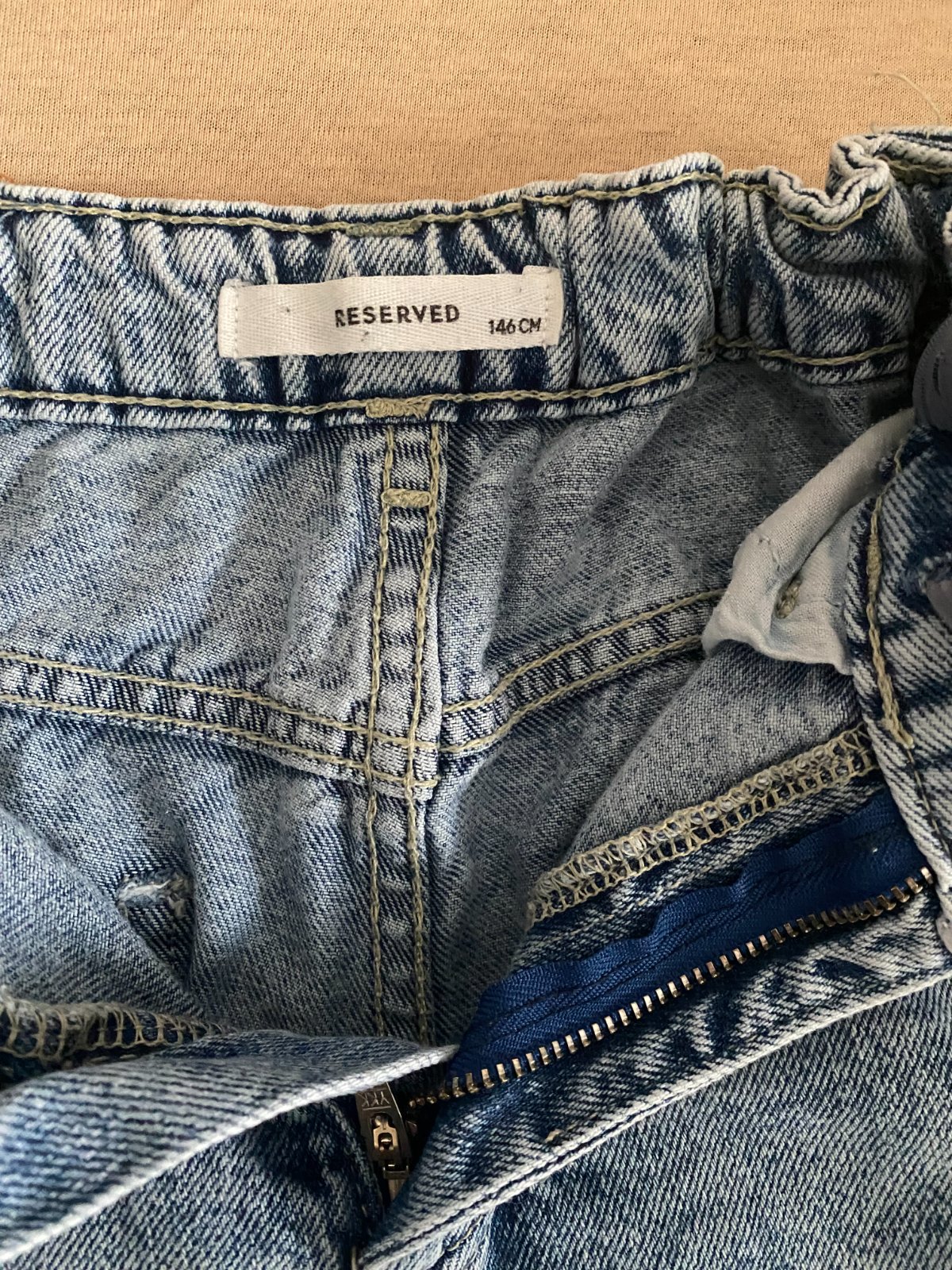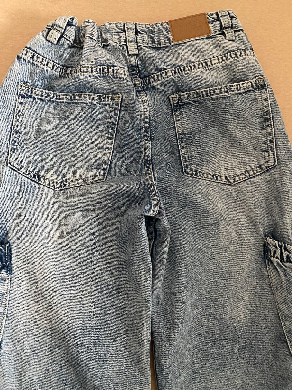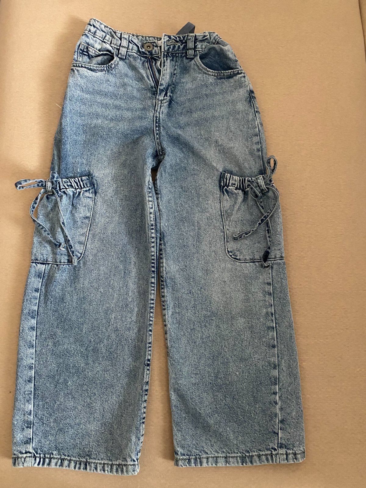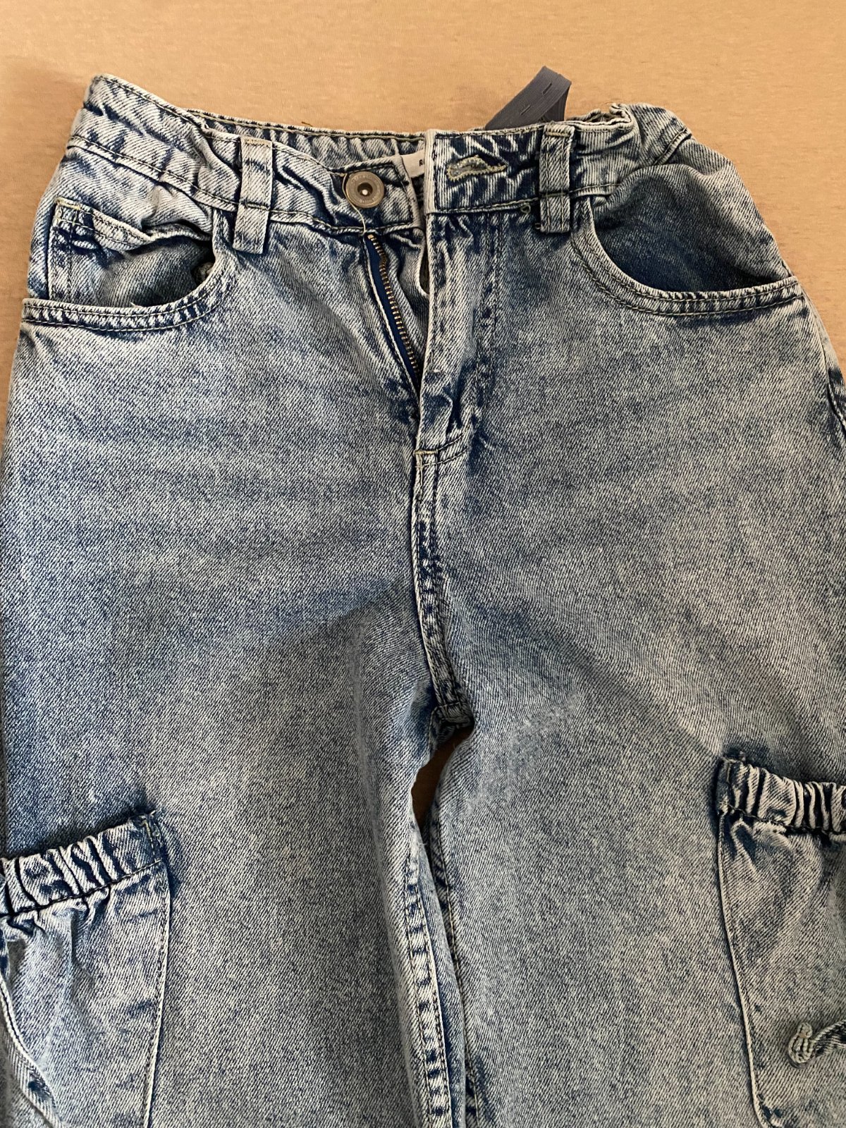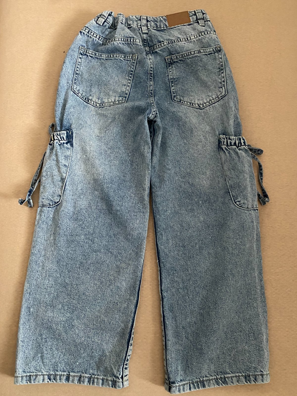 Dievčenské rifle so širokým strihom, veľmi kvalitné, v páse sú na gumu, majú klasické riflové vreckánvpredu aj vzadu a zaujímavé vrecká na nohaviciach. Vnútorná dĺžka nohavíc je 60cm, celková 85cm.