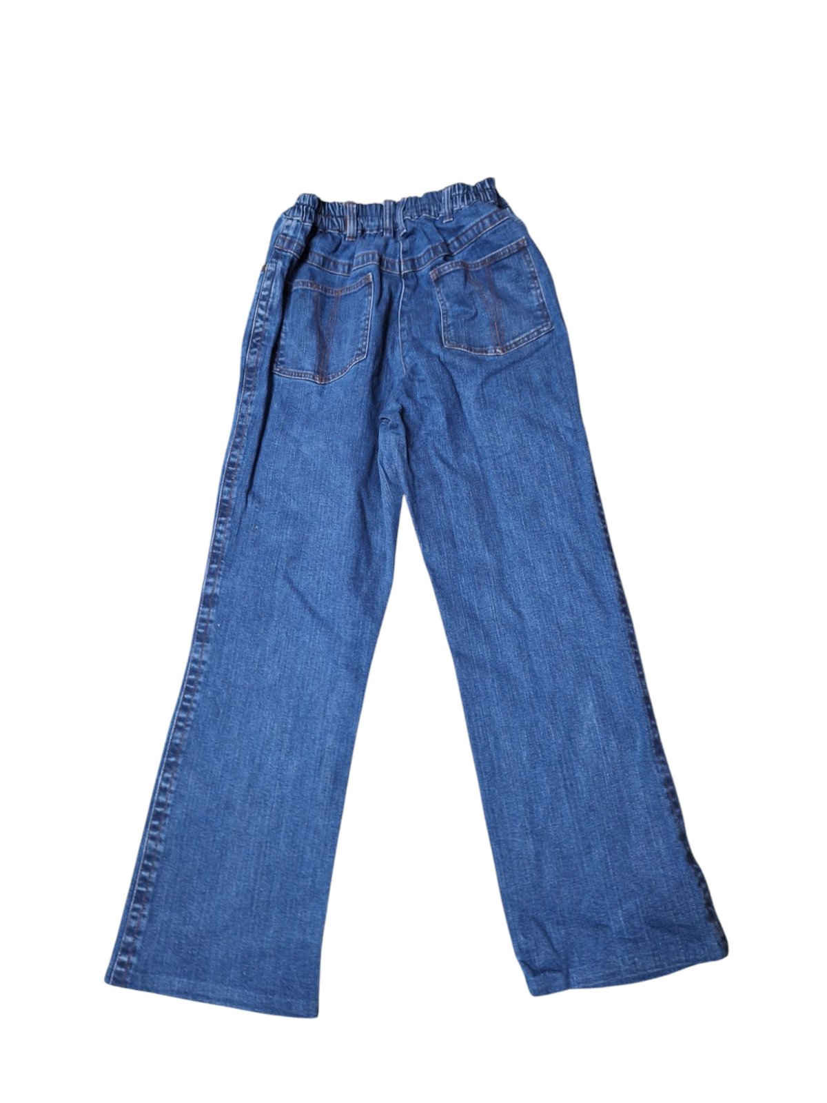 Detské rifle s gumou v páse. Zapínanie je vpredu na zips a gombík. Dĺžka je 100cm,obvod pása v kľude je 64cm, natiahnuté 84cm. kód 1786