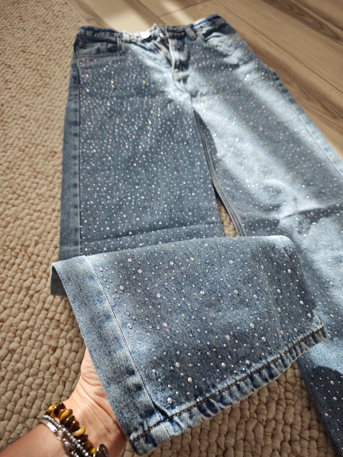 Pekné málo nosené rifle.Predné vrecká a spodné okraje nohavíc sú originál ošúchané. Celková dĺžka je 80cm, vnútorná dĺžka je 62cm a pas je 30cm