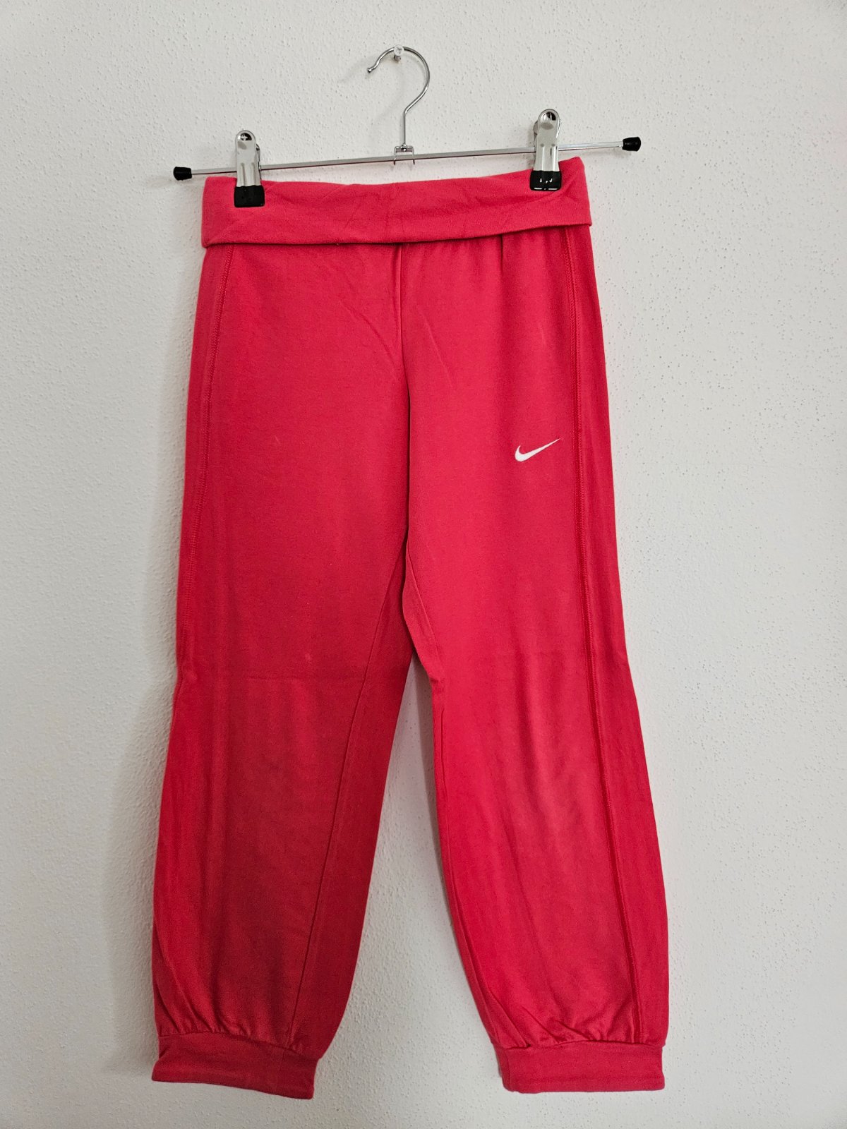 Nike športové nohavice s pružným pásom, možno ho nosiť ako vysoký alebo klasický, dole pružné zakončenia. Na pravom kolene drobný fliačik, pozri detail, inak veľmi dobrý nosený stav. Veľ. 116-128, zodpovedá ako naše 122/128.