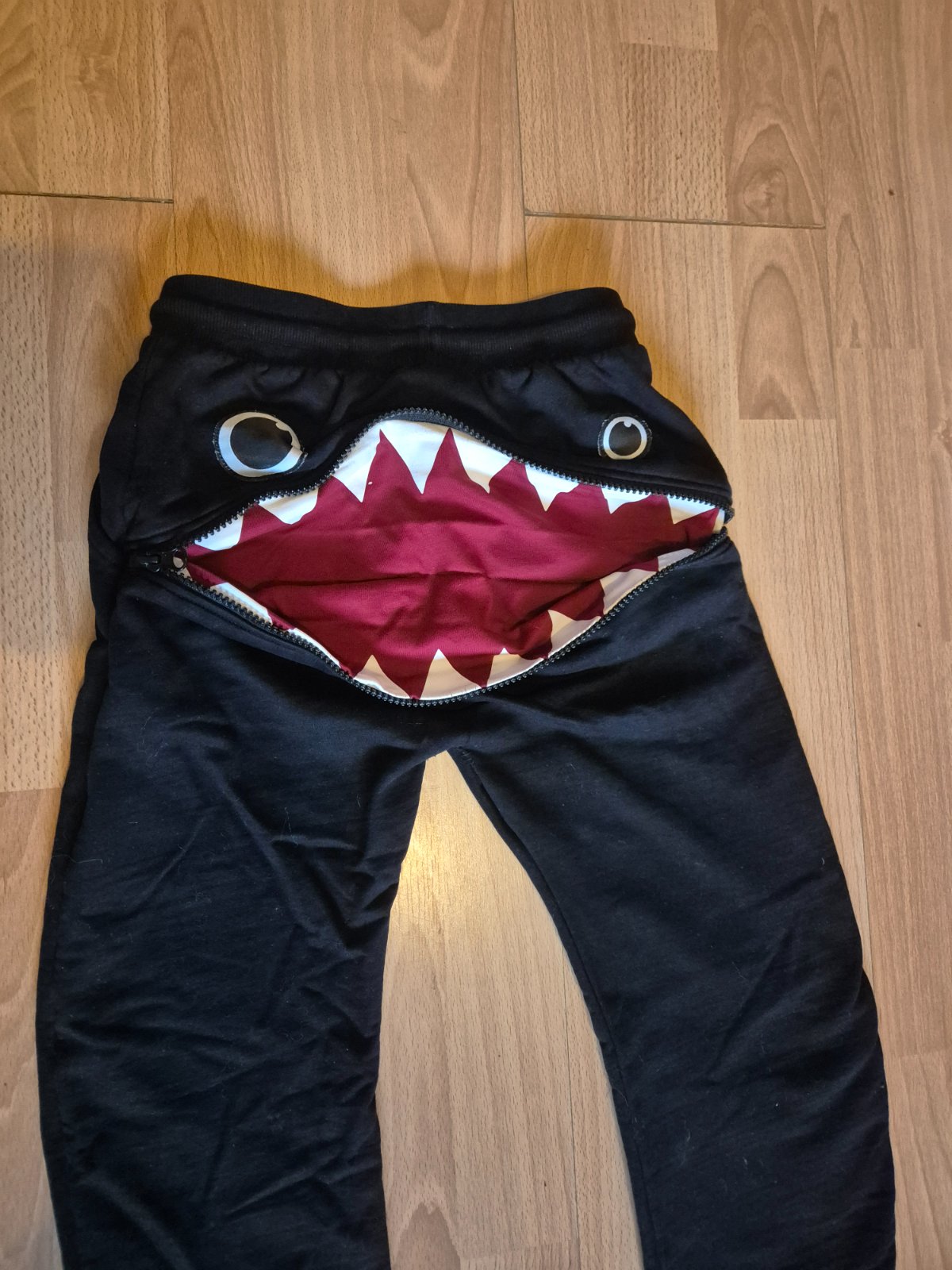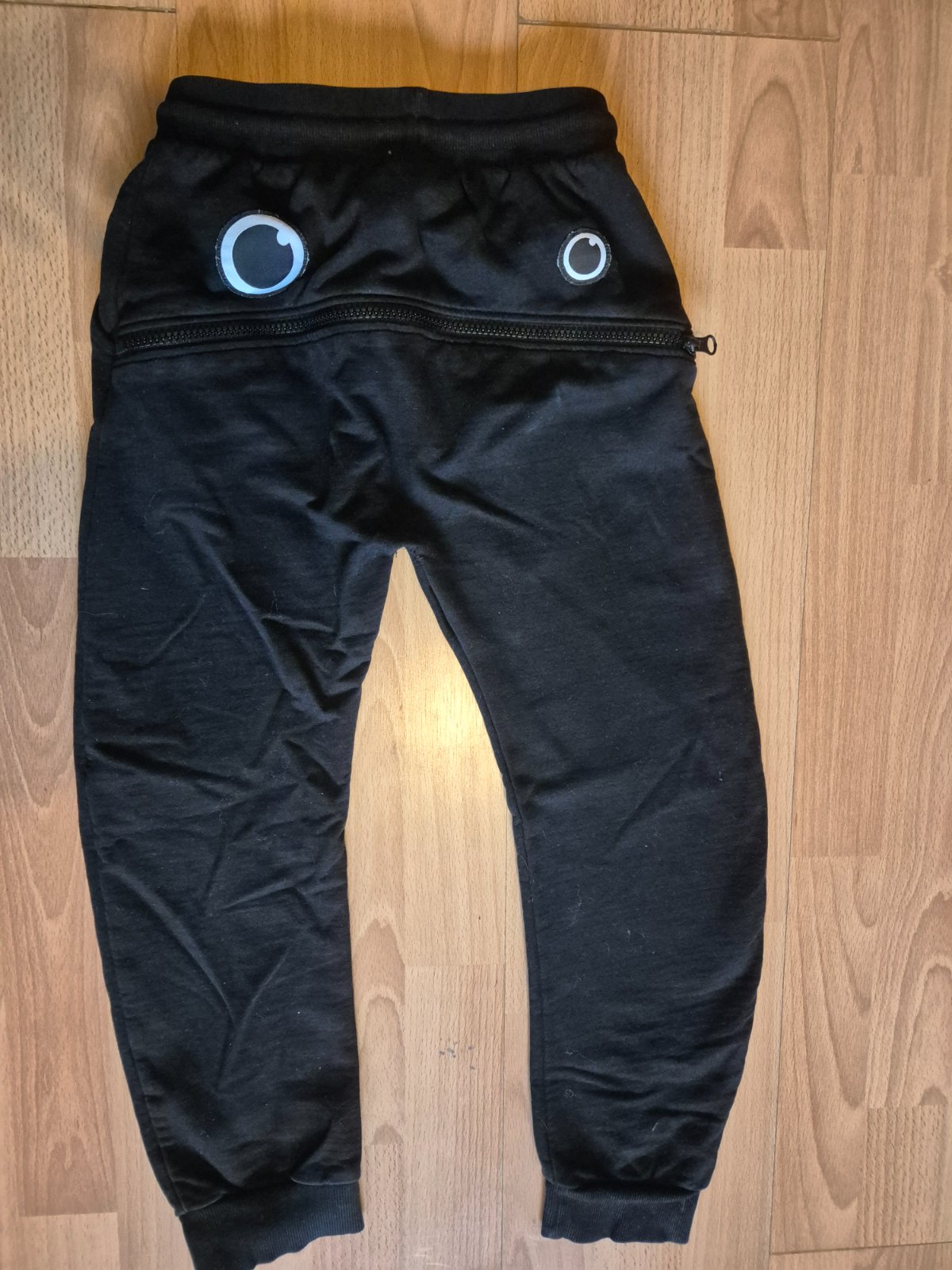 Predám krásne čierne tepláky s očami a zubami,pekný stav,párkrát oblečené,vel.128,značka Pepco,cena 3€