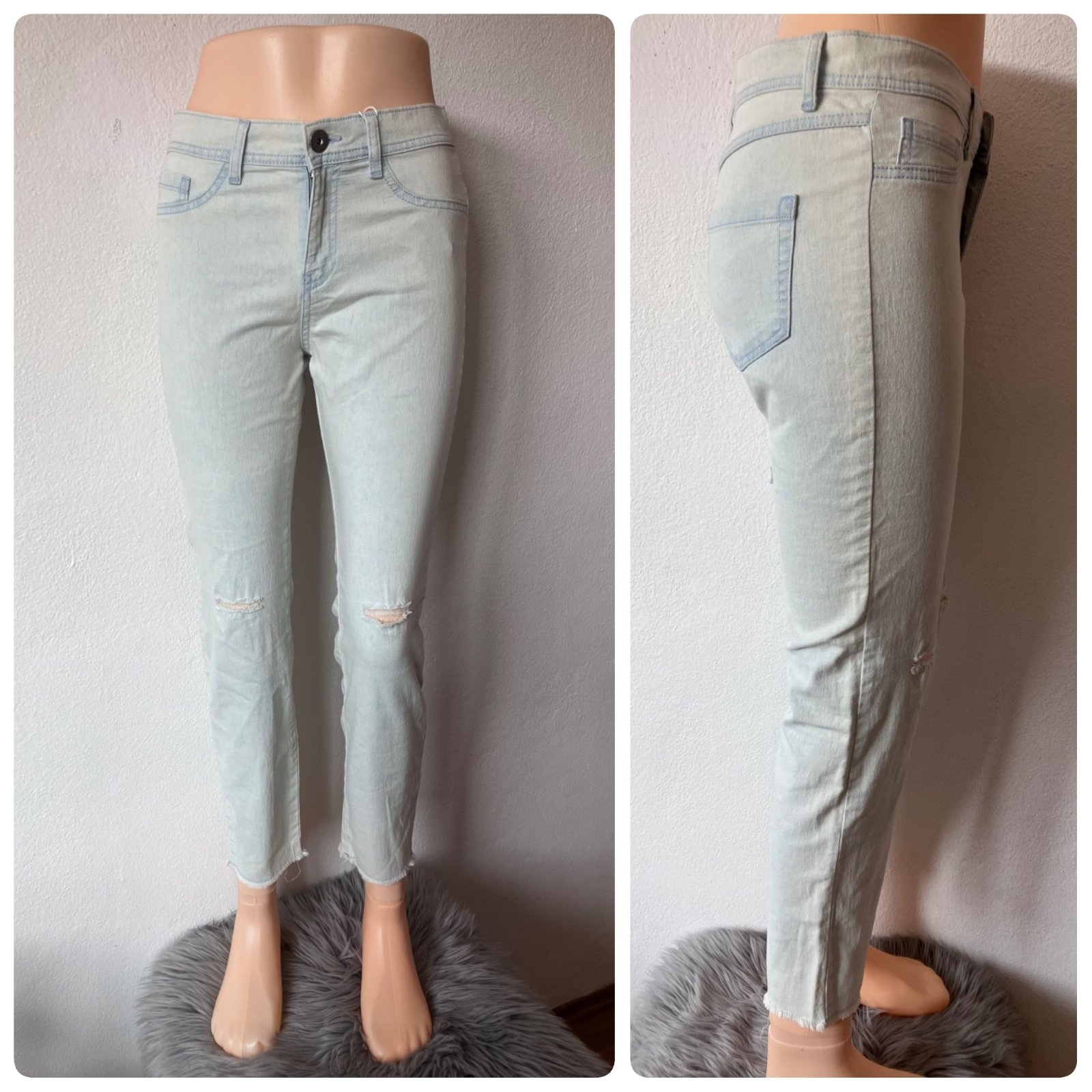 Dámske rifle, tenké, nie sú elastické, pútka na opasok, zapínanie na gombík a na zips. Materiál:81% bavlna,17% polyester,2% elastan. Farba: svetlomodrá.
