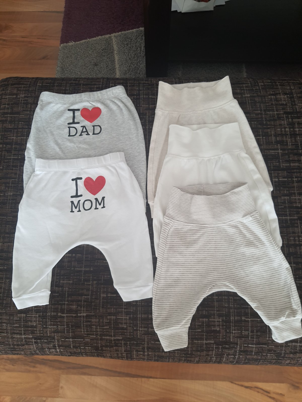 V ľavo nohavice veľkosť 68,ale v skutočnosti sedia na 56-62, pridám k nákupu zdarma. V pravo 3x H&M. Krásny stav, ako nové. Málo nosené.