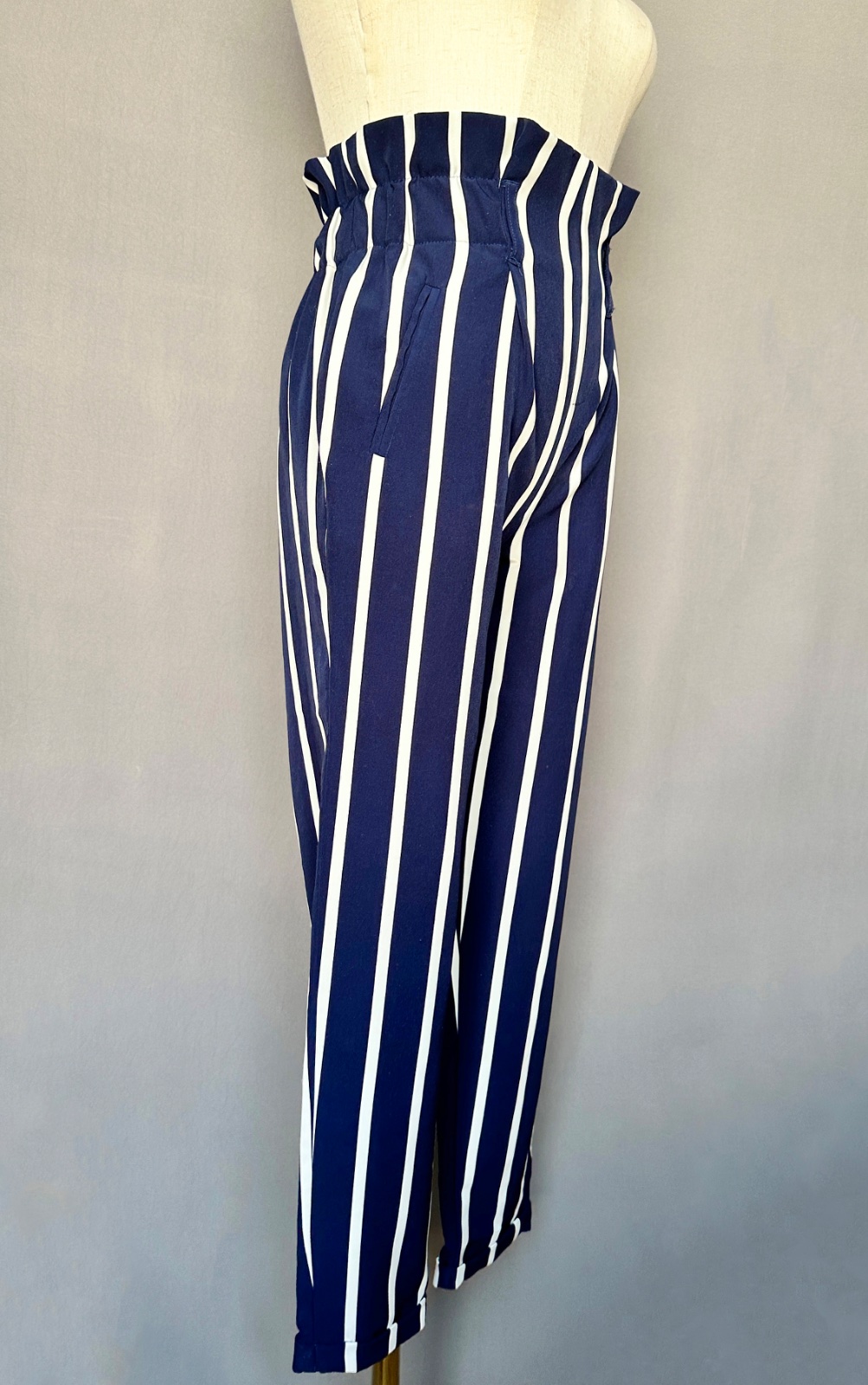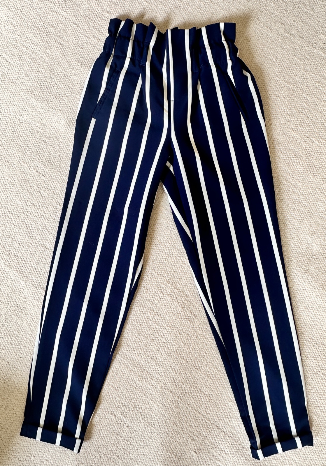 Elegantné nohavice s vysokým pásom a vreckami na ruky v trendovom prevedení tmavej modrej s bielymi vertikálnymi pásmi. Veľmi pekne sedia na postave. Materiál je mierne elastický, padavý (vísačka žiaľ nie je k dispozícii). V super stave, bez poškodení.