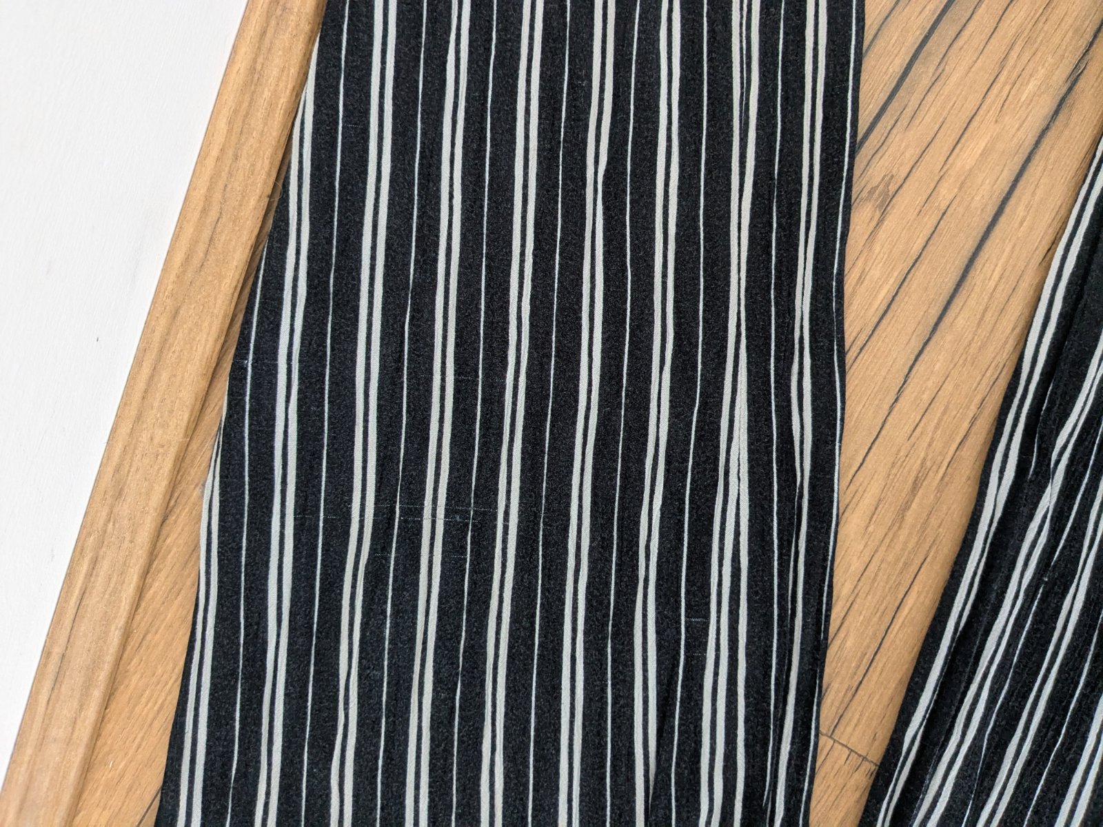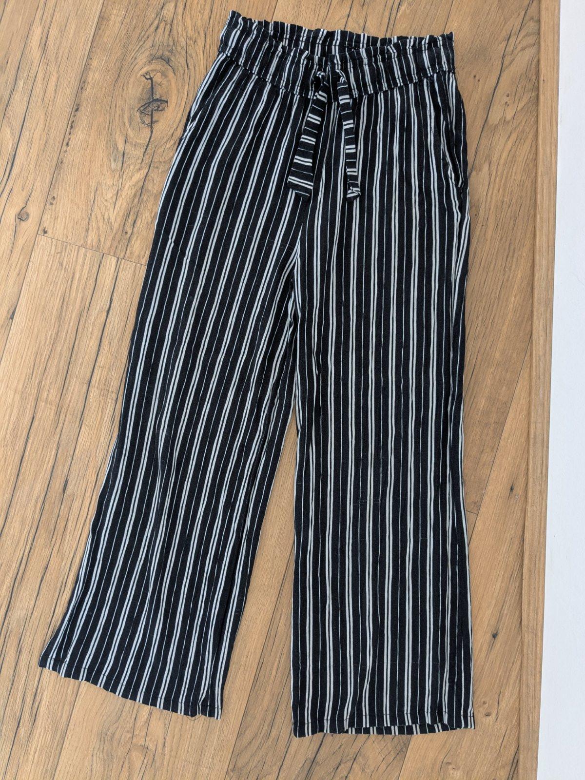Ľahké letné nohavice, v páse gumka plus šnúrka, 2 vrecká, majú zopár nenápadných akoby zatiahnutí (viď foto) a zašitú minidierku v dolnej časti, inak OK.
