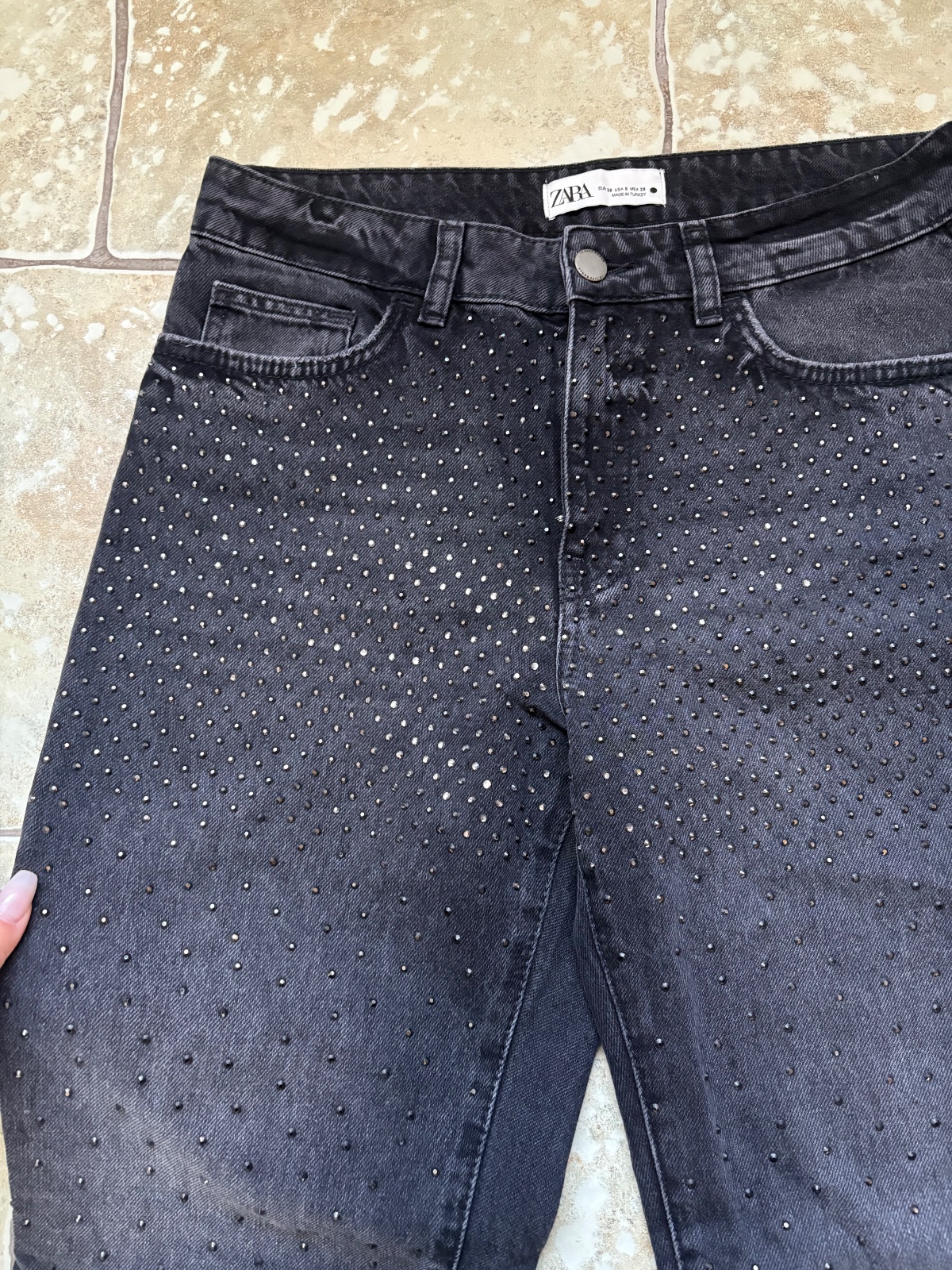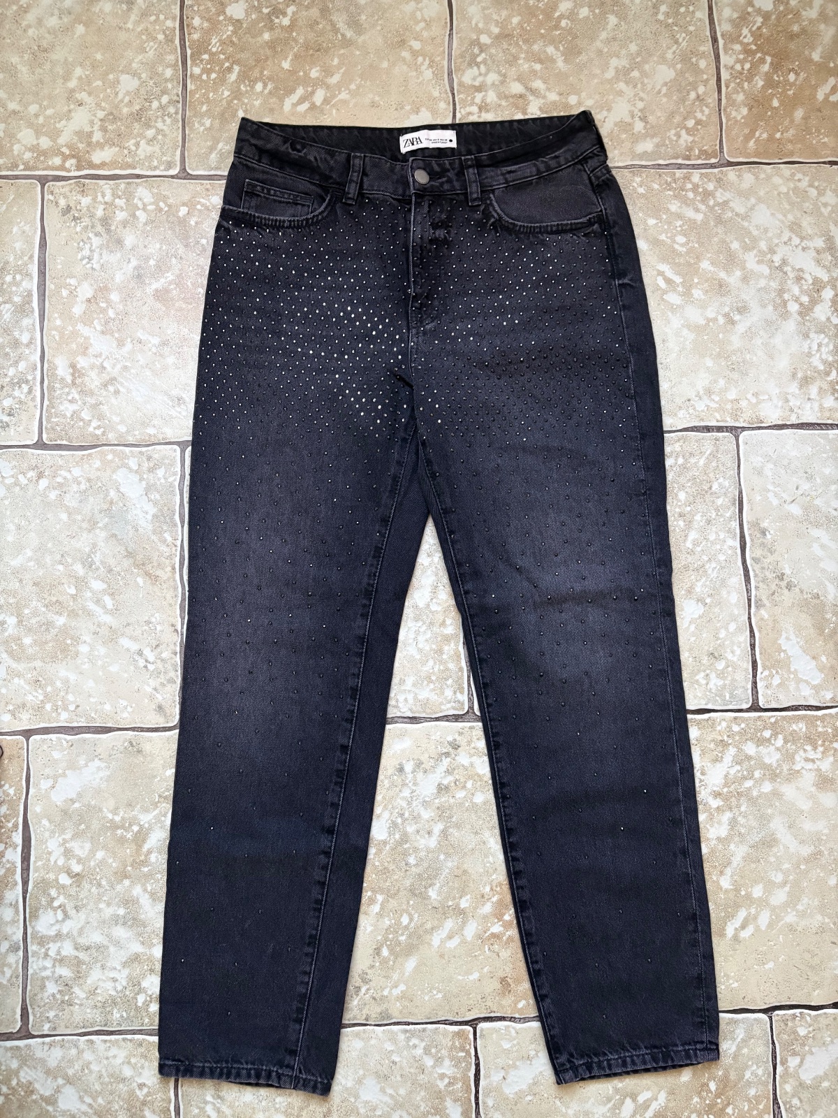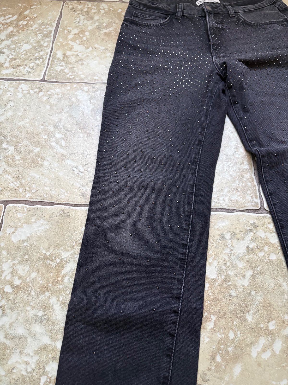 V ponuke krásne jeansy s kamienkami zo Zary. Veľkosť uvedená 38, celková dĺžka 100.5 - 101 cm, pás 39 cm. Pevnejší materiál, rovný strih, stredne vysoký pás. Párkrát nosené, bez poškodení. Odporúčam.