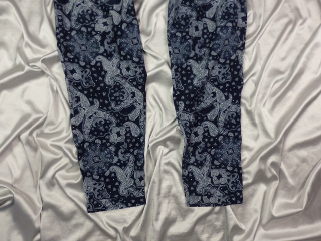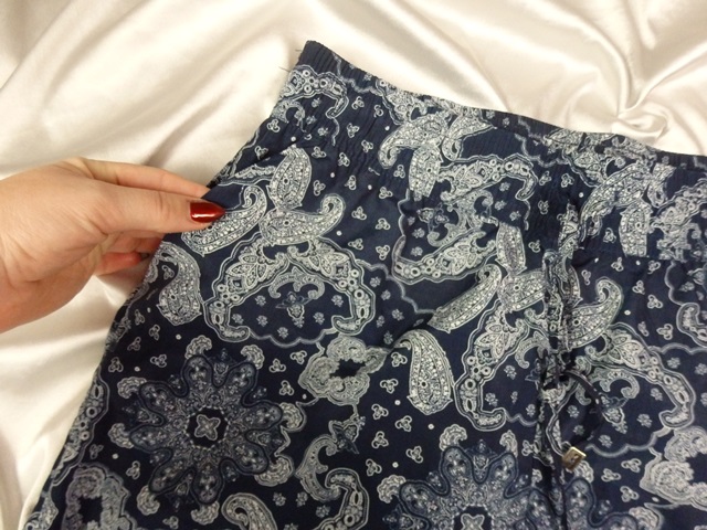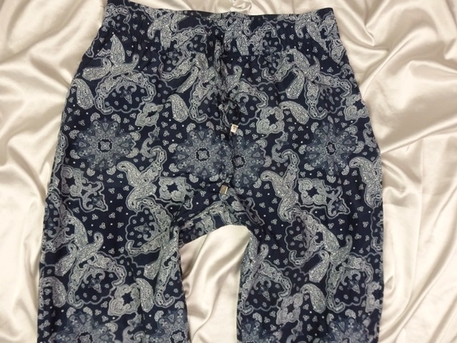Kvalitné letné nohavice tmavomodrej farby s potlačou, v páse gumka, materiál 100% polyester, nové bez visačky.