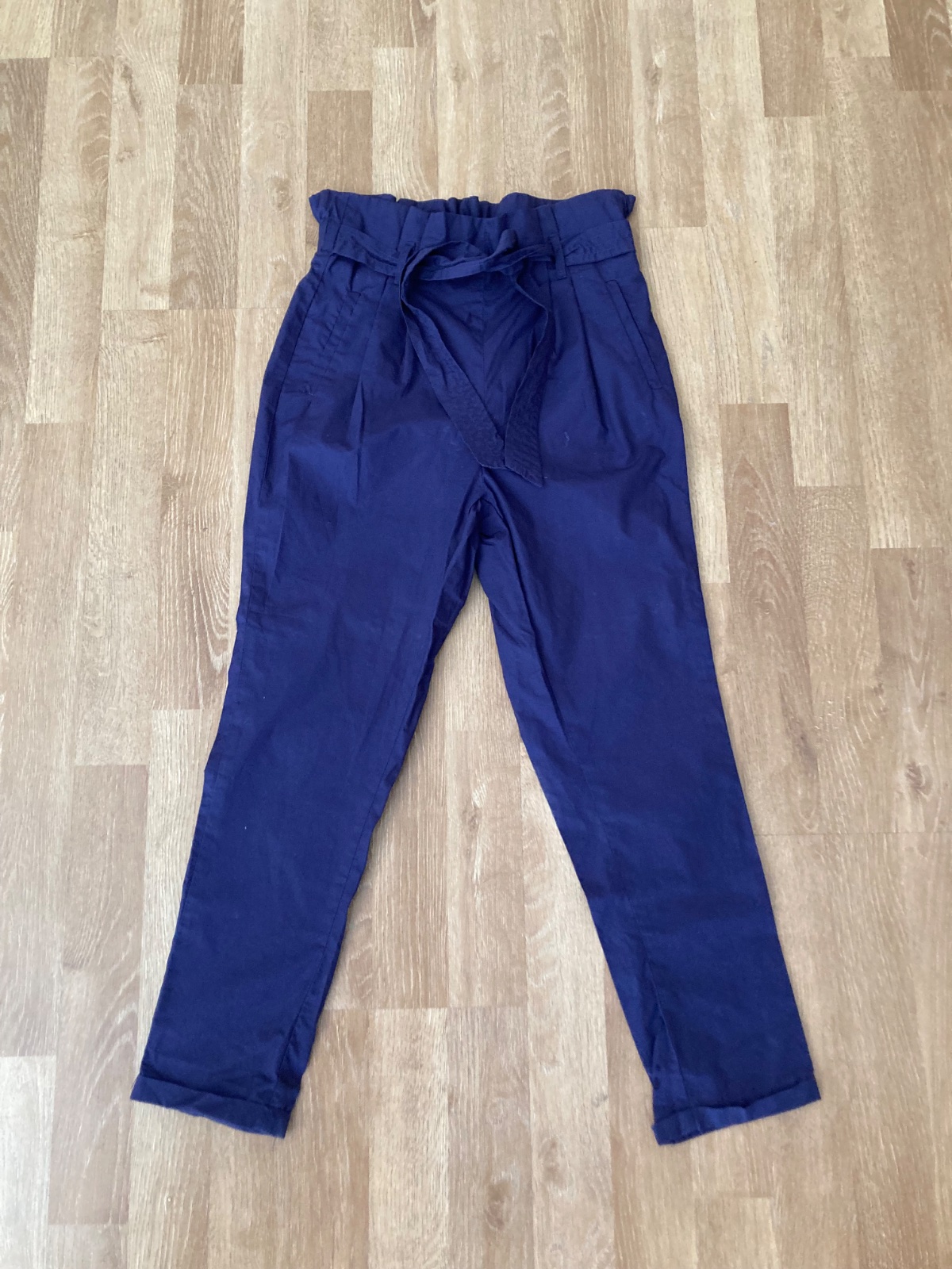 Stylove siroke nohavice s jemnymi pruzkami, celkova dlzka 80cm, od rozparku 55cm, stahovatelny pas v klude 32cm. Farba je syta tmavomodra, na foto dobre nevidno. Mozny osobny odber ba-petrzalka ale...